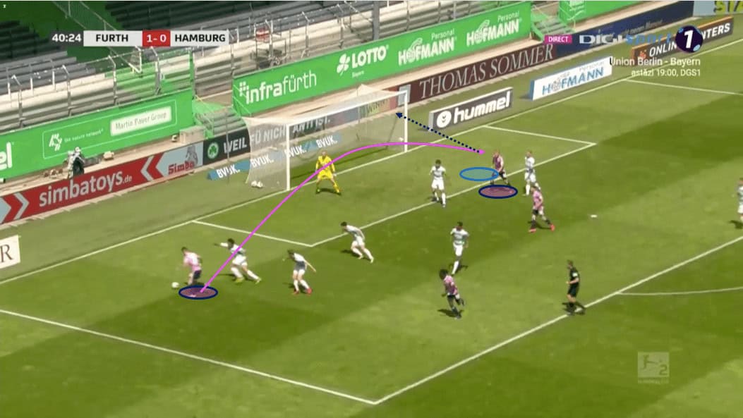 We will start with the goal Fürth conceded from a cross before finishing off with Hamburg’s efforts. The first ball is played from Jatta to Leibold, and Leweling initially does well but has to know Leibold is a one-footed player. By giving Leibold his left, you are asking for trouble.