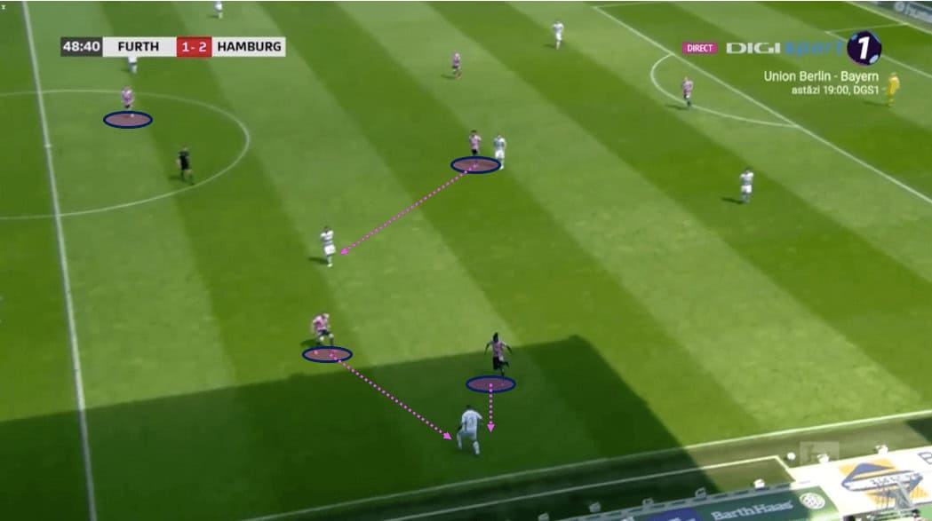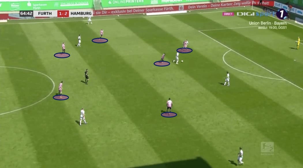 Hamburg’s best patch came between the 61st to 75th minute of the game with a peak of 6.7 PPDA. What Hecking’s side did well was force Fürth to play a tempo they weren’t comfortable with. Hamburg also played a much higher line in this time, and Fürth struggled. The picture above shows substitute David Kinsombi pressing Seguin, Kinsombi has teammates around him pushing the defensive line. Hamburg’s shape makes it very different to play out from, Seguin’s only option is passing back to the keeper.