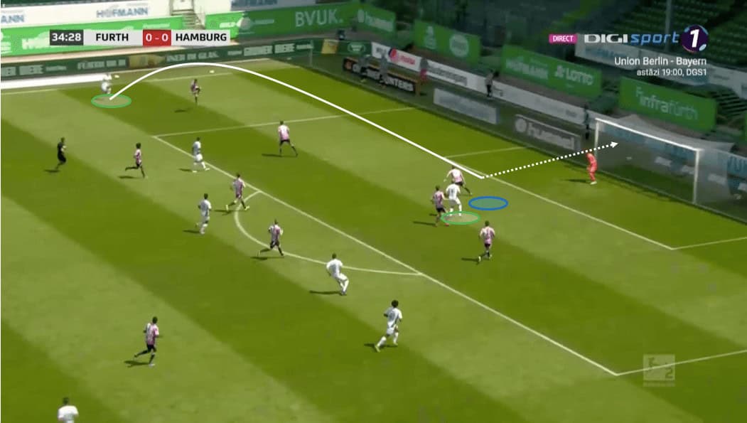 Fürth’s build-up play was smart and precise, exploiting the areas Hamburg failed to cover before crossing the ball into the area. It was a real feature of their performance, and when Hamburg continued to remain tight defensively, Fürth kept going to the full-backs in Wittek and Meyerhöfer on the flanks.