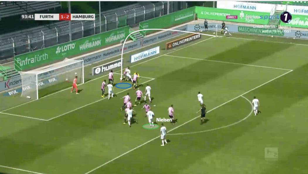 Onwards to Hamburg who gave up both goals to Havard Nielsen. The first coming on 35 minutes while the equaliser in stoppage time. The opener for Fürth comes from a brilliant cross by Wittek. The initial position for Letschert isn’t too bad: if the cross is weak, he will be able to intercept. The issue comes behind the Dutch defender, like Wittek before it’s Beyer giving Nielsen goal-side positioning. In this case, Letschert misjudges the flight which is perfect for Nielsen who scores past Daniel Heuer Fernandes. Like the first goal, the defensive aspect is inferior and arguably avoidable. However, the cross is too good that Nielsen was going to be the only player winning it.
