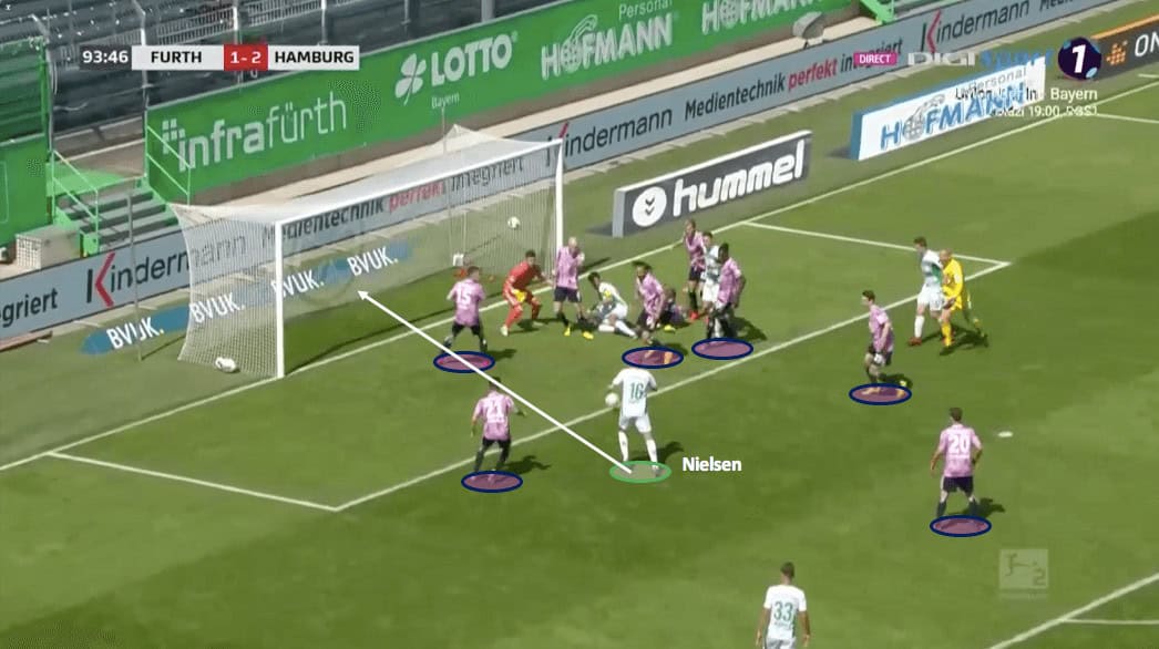 As the ball comes in, chaos pursuits and now it’s on the ground. Players are fighting to get it on goal or clear. Nielsen is highlighted, Leibold is closest to him, but there are six Hamburg players who in theory don’t have a man amongst all the drama. The ball pops out to Nielsen fortuitously, and he scores once more. The scrappy stoppage time can be challenging to analyse, but it can’t be helped that this situation could’ve been defended better. Nielsen shouldn’t have that much space; it also fits the agenda of Hamburg doing typically Hamburg things to drop a game they’d almost put away.