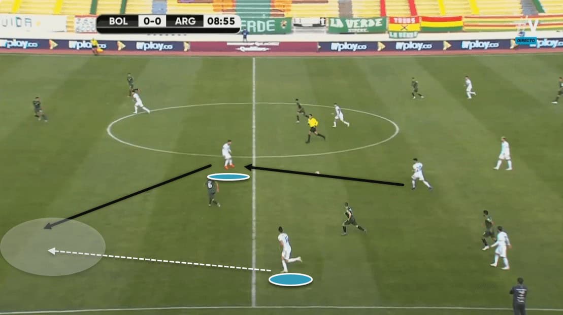 Argentina’s build-up was not based on possession like their opposition, as Armani was instructed to launch long balls instead of using central defenders to progress. However, Argentina used their midfielders, Paredes and Palacios to progress the ball from Bolivia’s first line of press.