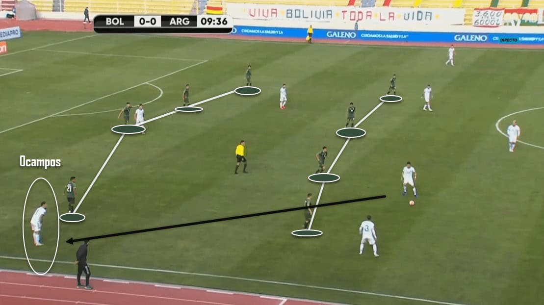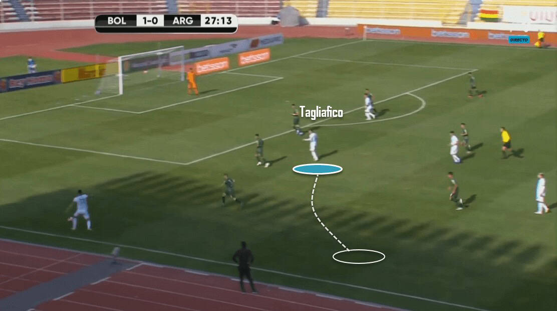 While Ocampos was placed wide, Argentina made sure the half-spaces were covered well to transit the ball from wide to centre by inverting players on several occasions. In this case, Nicolas Tagliafico, the left-back is seen making an inverted run through half space to occupy the Bolivian defence and maintain the pressure at the same time.