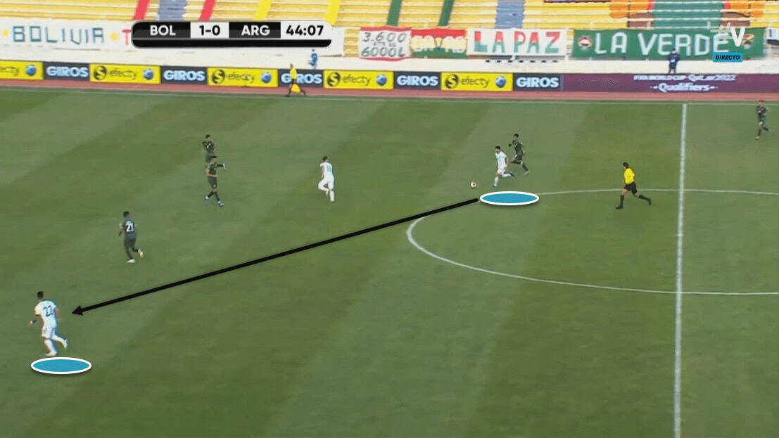 The above example, in the eighth minute, resulted in a shot from Paredes that hit the woodwork. Paredes was able to register four shots from outside the area, which allowed Argentina to register shots at opposition goal despite being under pressure for the initial minutes in La Paz.