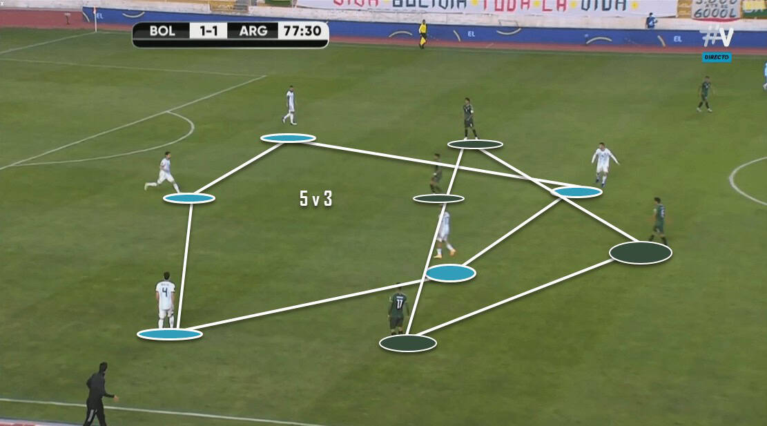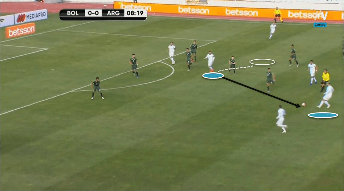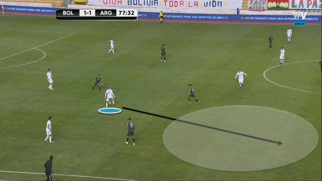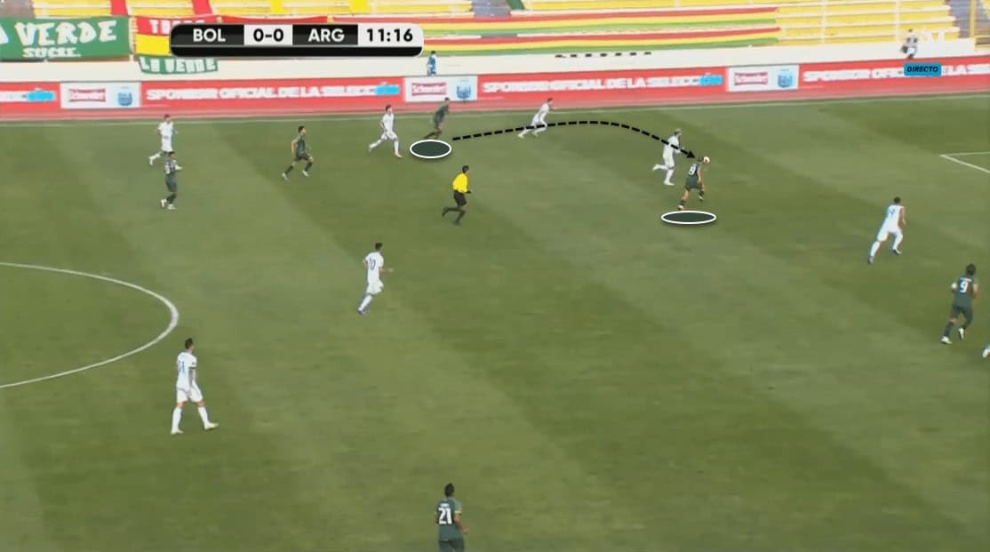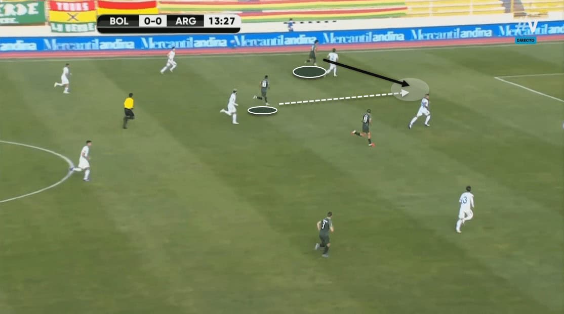 Just as they won the first ball and used their centre-backs to distribute, Argentina then could sense the space created when Bolivia attempted to break the numerical superiority. Like we can see above, passing into space is more convenient as compared to the shapes seen in the initial minutes for Argentina.