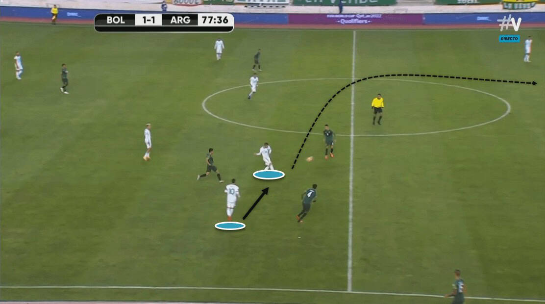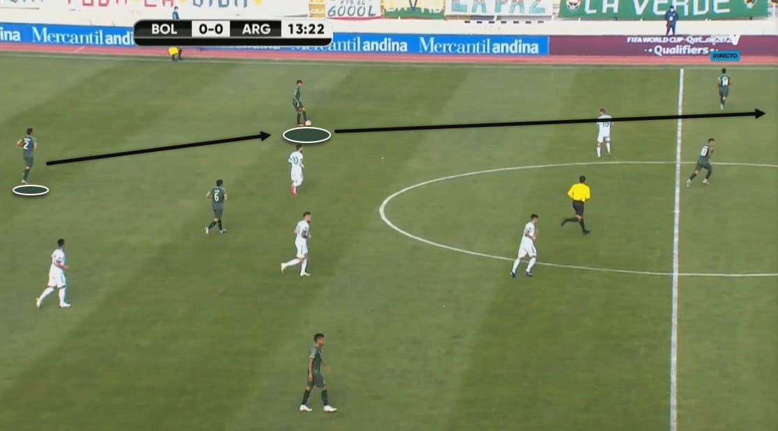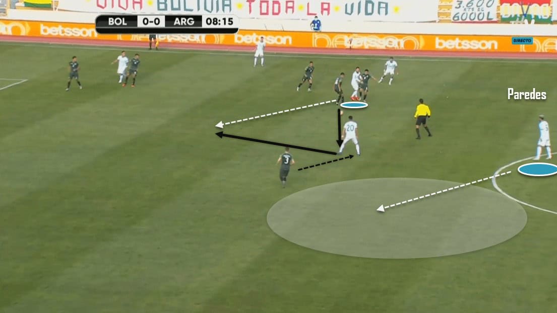 Another tactical trait that Argentina hugely demonstrated was the use of Paredes to exploit wide space between second line and first line of opposition press. As a deep-lying midfielder, Paredes was positioned between the huge space between Bolivia’s line to play into spaces.
