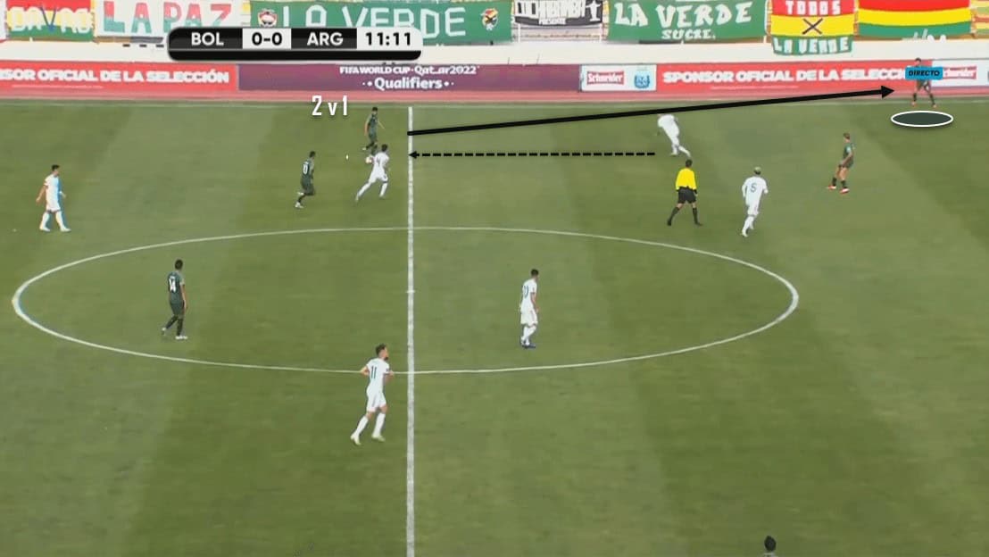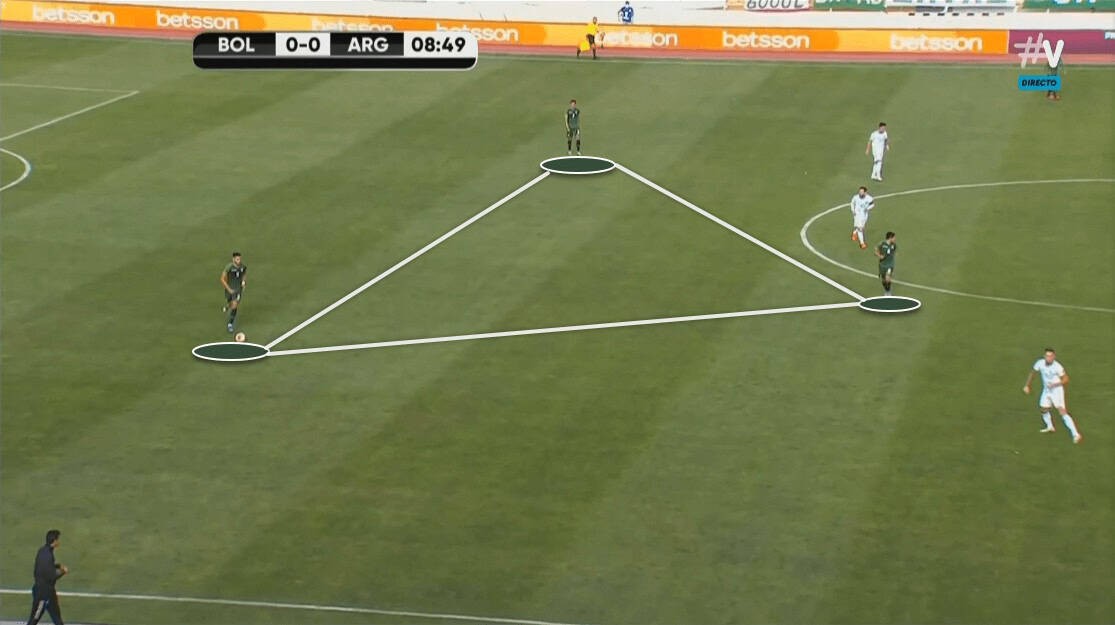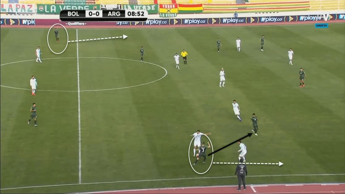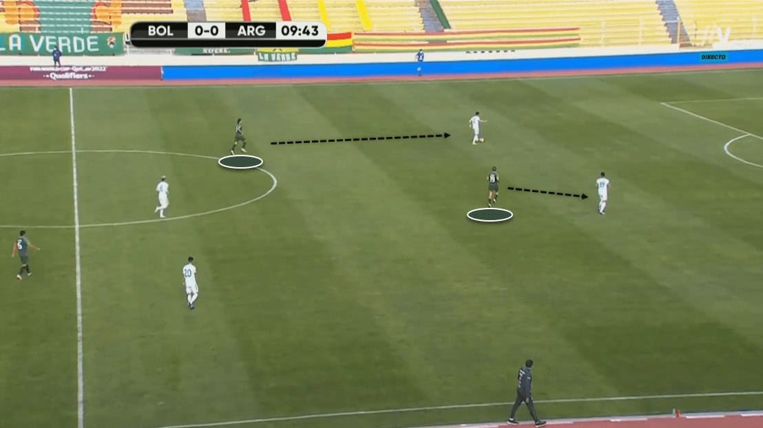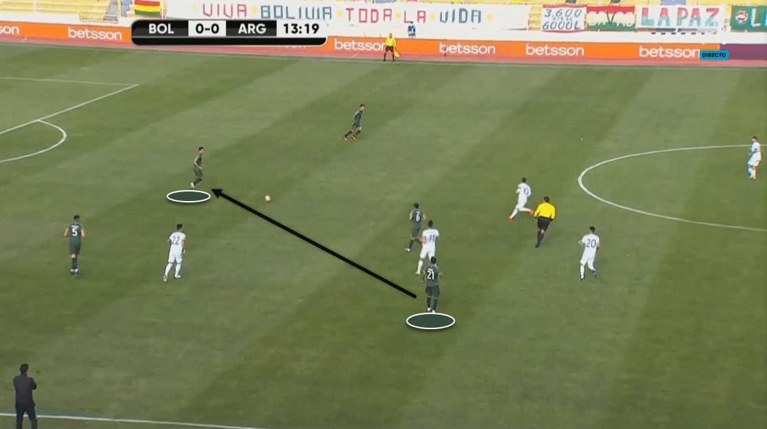 Bolivia’s build-up was largely focused on overhauling the midfield and progressing from the side-ways. Argentina did not seem to press higher and Bolivia were allowed to play out from the back.