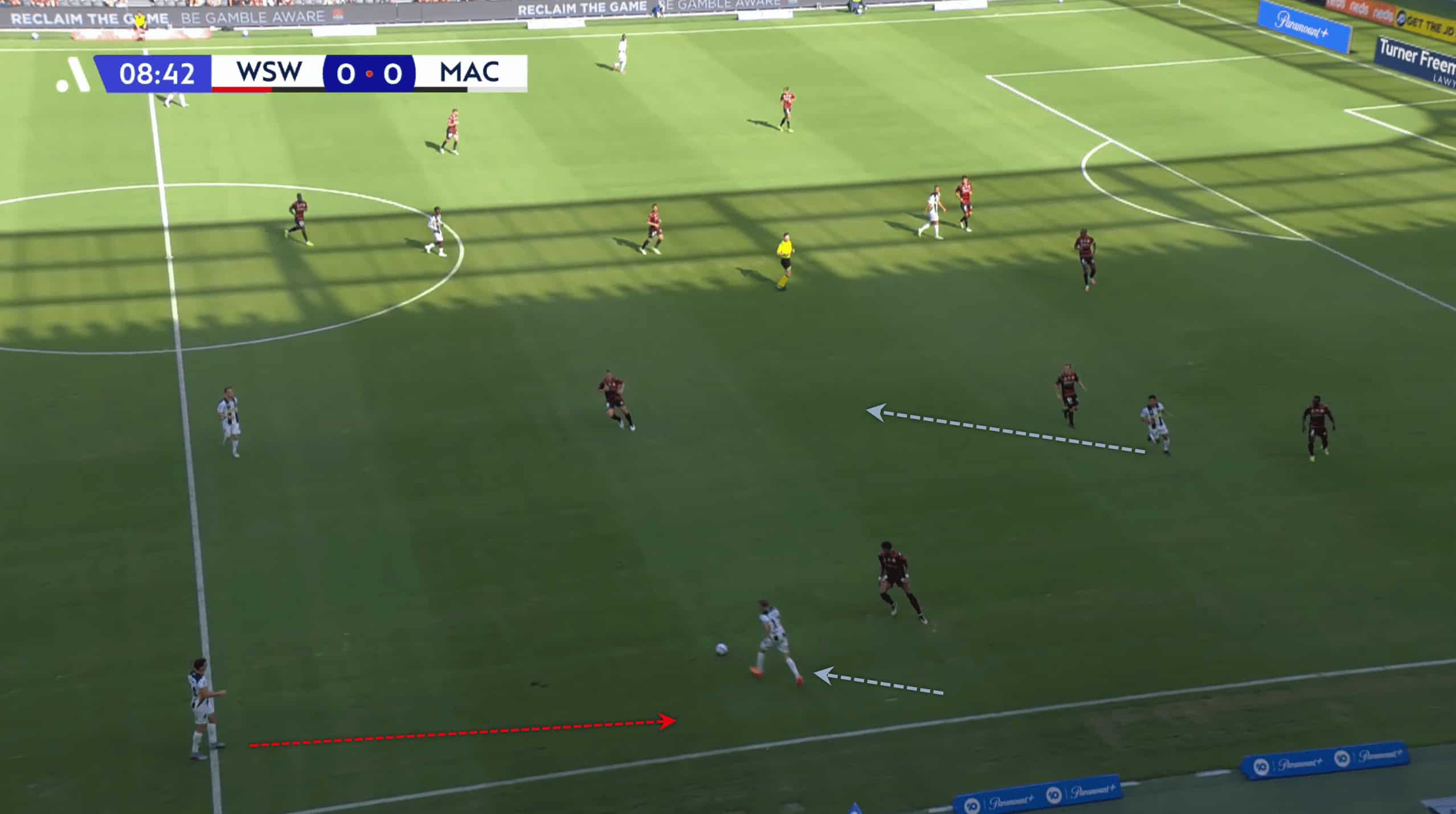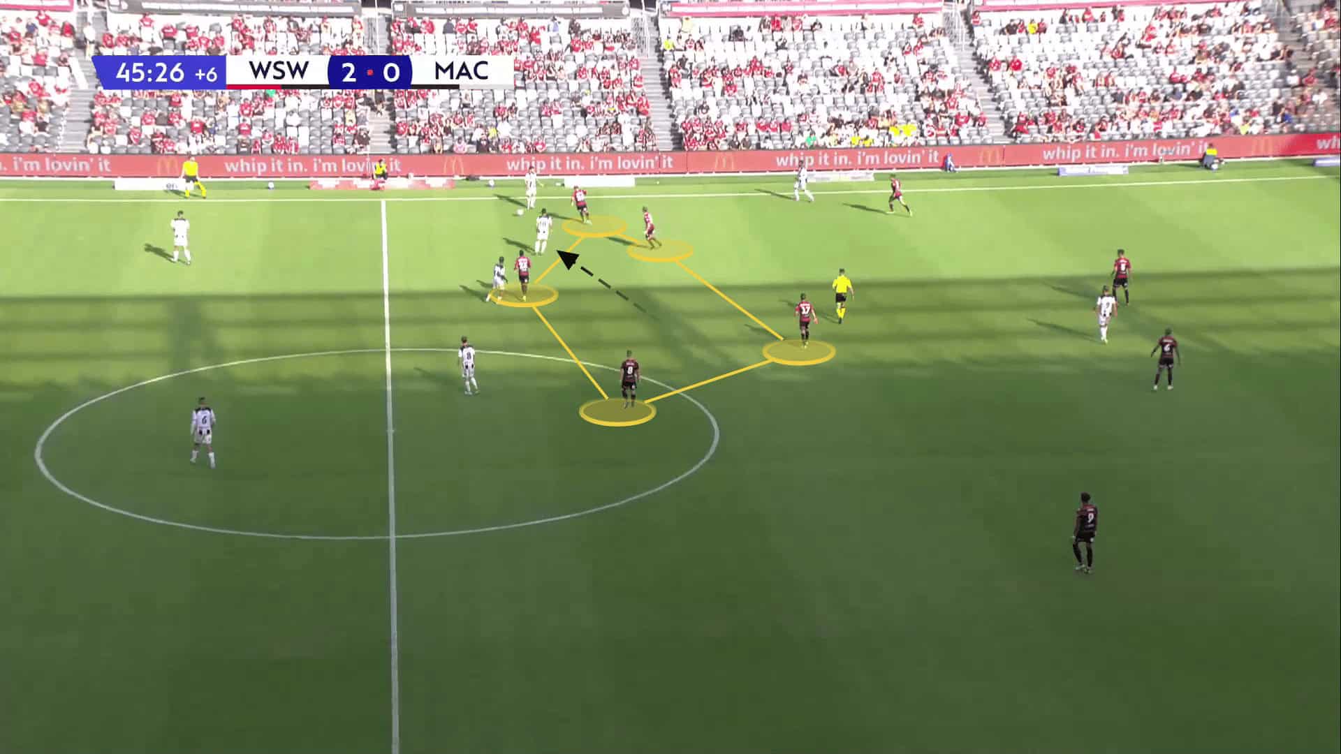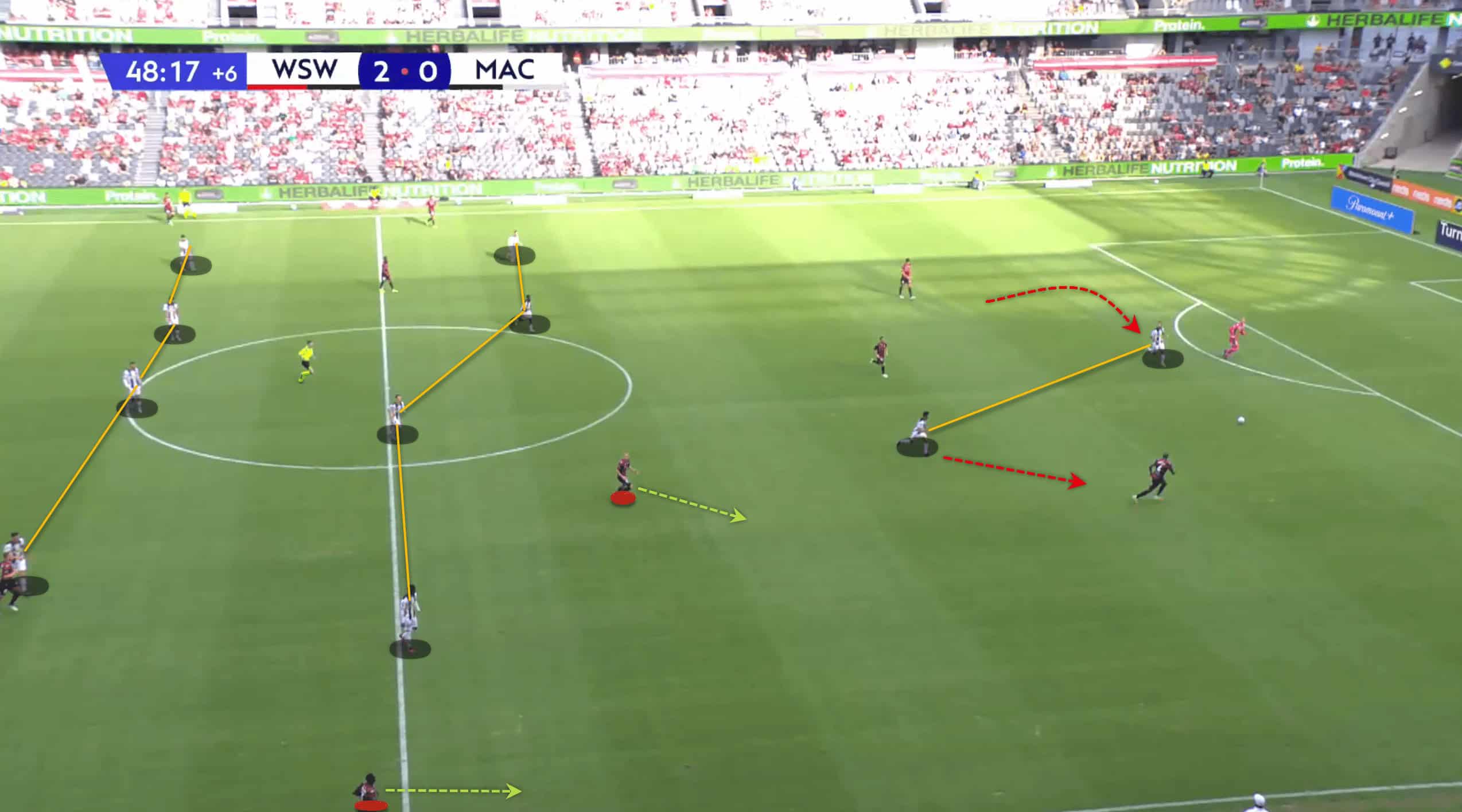 Macarthur’s pressing hugely benefited the Wanderers in their constant attacking plan. The cooperation required to successfully press was duly lacking. Nobody appeared to be overseeing the team’s pressing, thus each player pressured the ball carrier of his choosing.