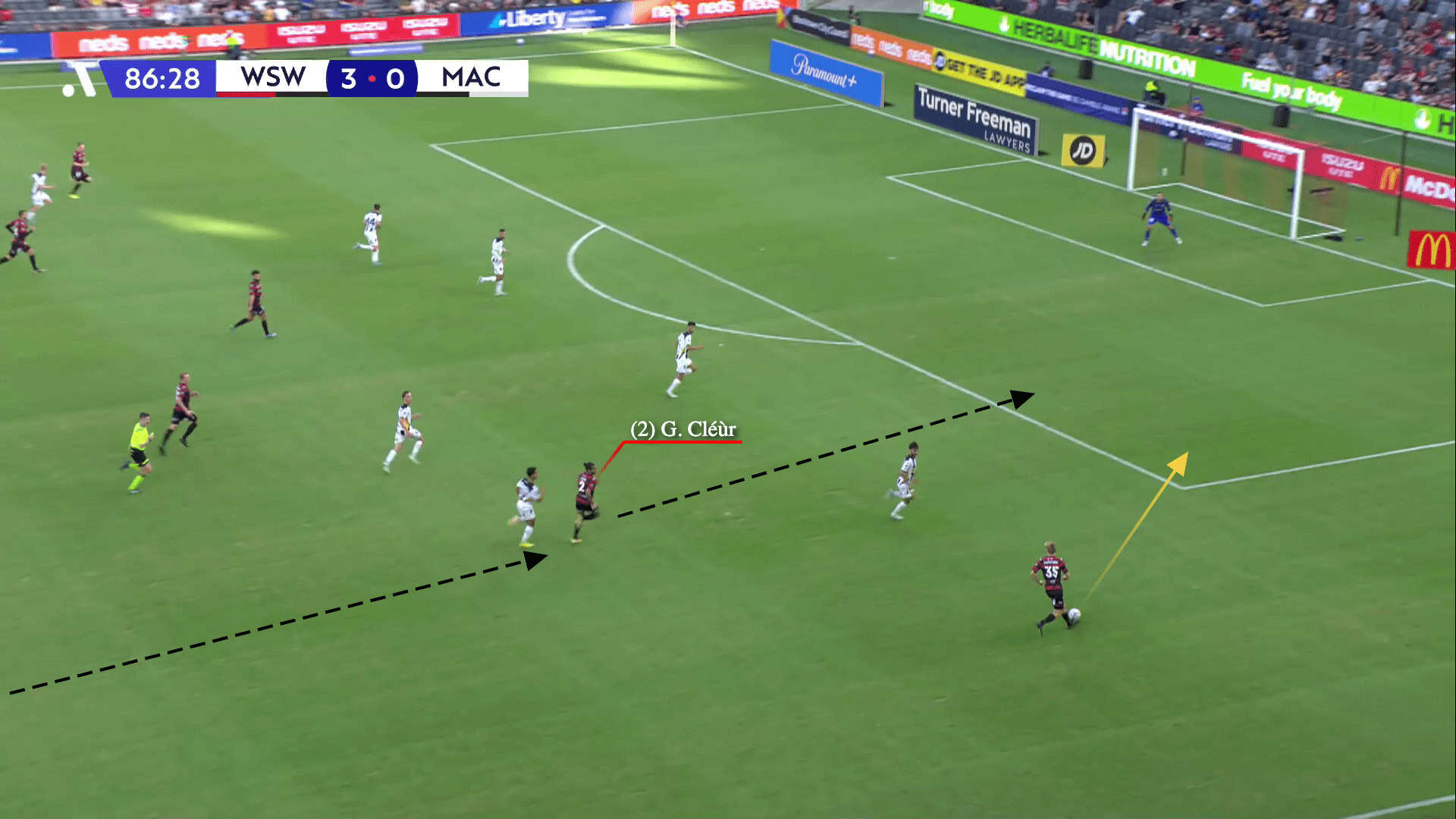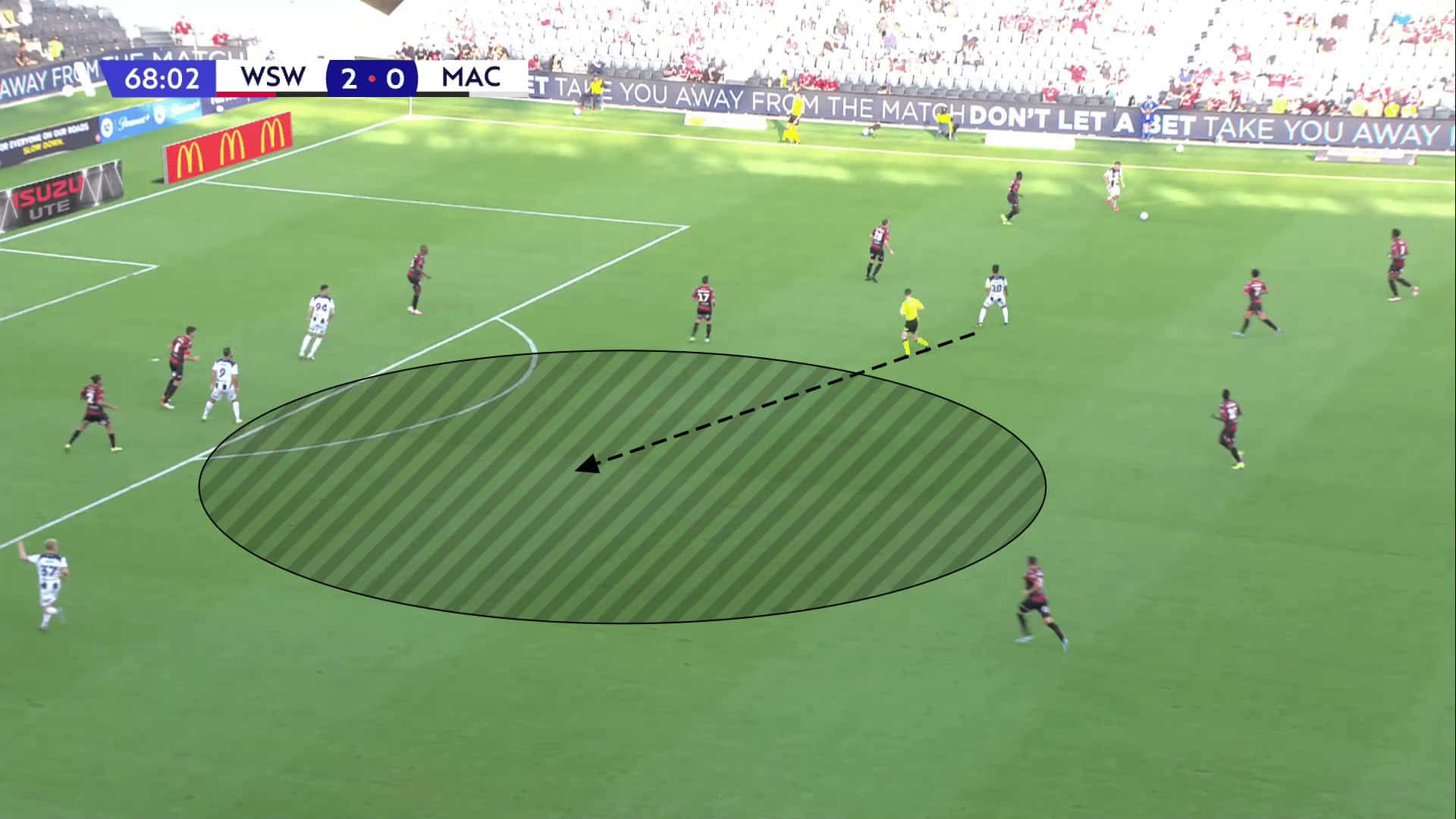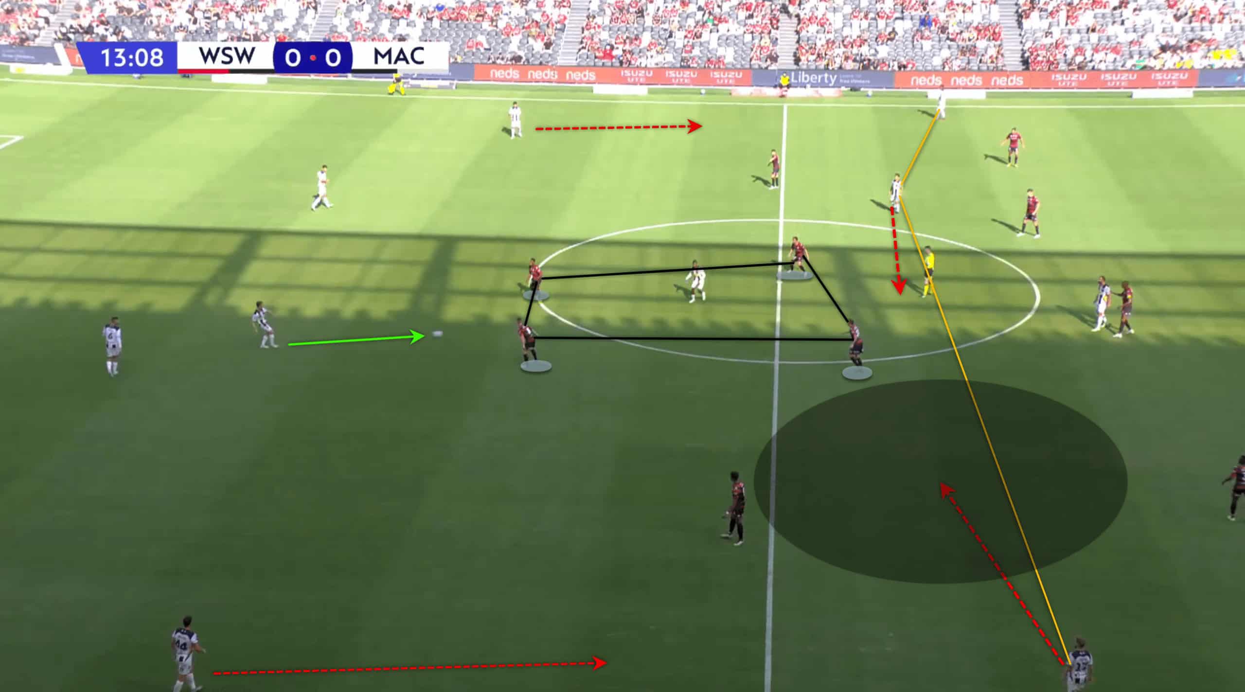 Macarthur’s pressing hugely benefited the Wanderers in their constant attacking plan. The cooperation required to successfully press was duly lacking. Nobody appeared to be overseeing the team’s pressing, thus each player pressured the ball carrier of his choosing.