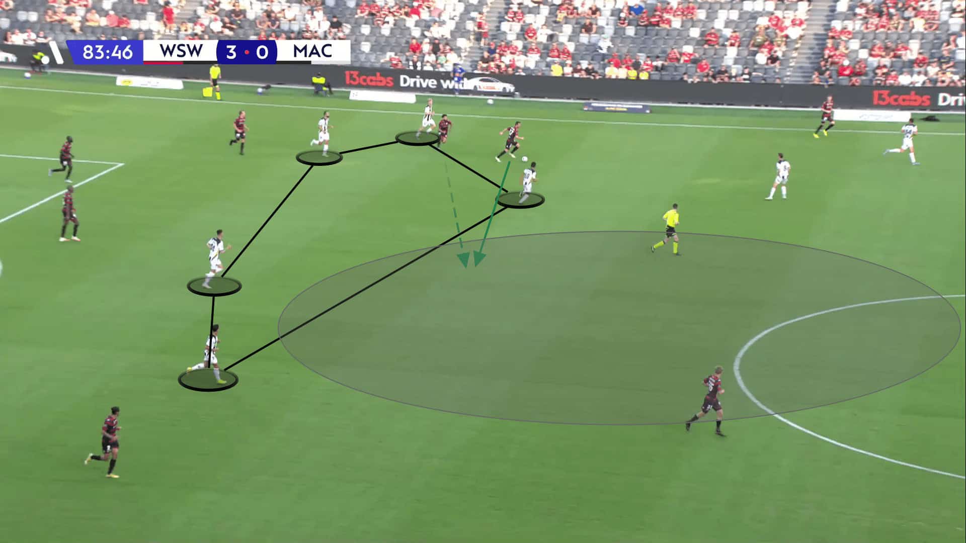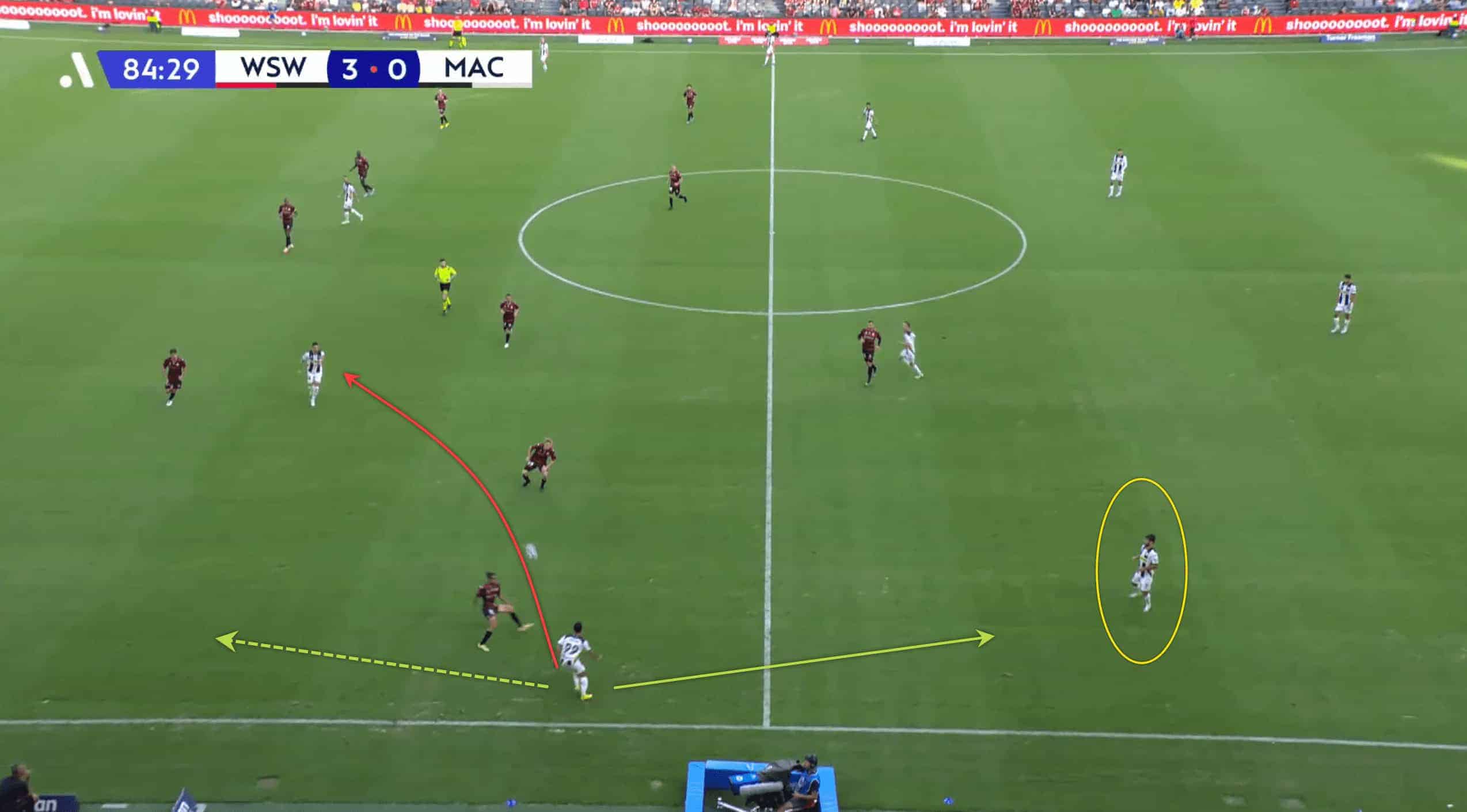 When applying pressure, the awareness to also check if the team is pressing is one important part of the game. In the modern era, this wouldn’t be tolerated, as anyone would stand a chance to take Macarthur to the ground. Each took turns pressing alone and getting beaten, giving WSW a lot of room as in the above photo.