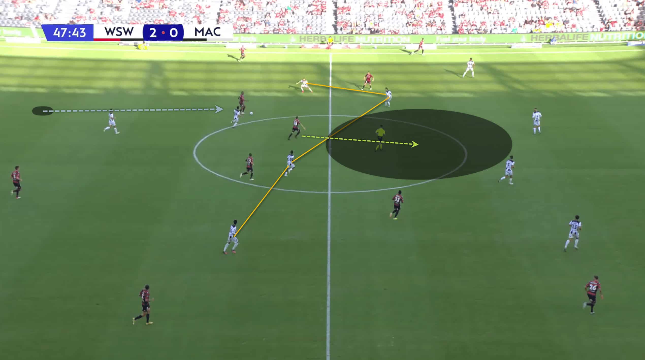 The centre-backs of Macarthur were very comfortable having the ball and roaming around to find the right pass. Nieuwenhof’s positioning dragged a few attackers and gave room for the defenders to use the space upfront.
