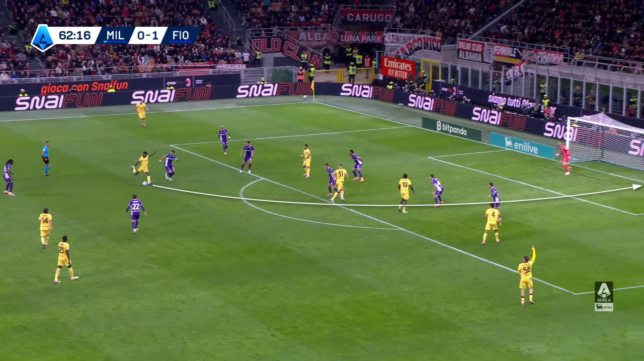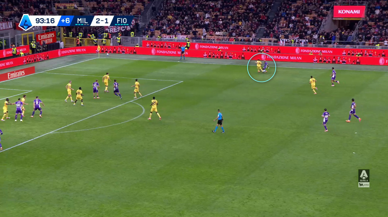 Another important aspect of AC Milan’s attacking tactics in this match is Fofana’s recurrent penetrations into the box and his presence usually inside the final third to add numerical superiority on key occasions.