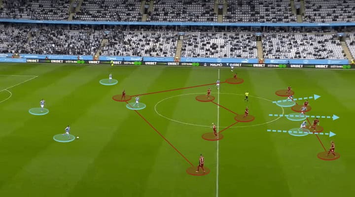 Malmö’s dynamic use of wingers was interesting. Veljko Birmancevic was more a threat in the offensive third, staying higher to push the defence, but Jo Inge Berget had a hybrid role. The Norwegian player would position himself in the half-spaces on occasions, which was an action to manipulate the second line of the defence.