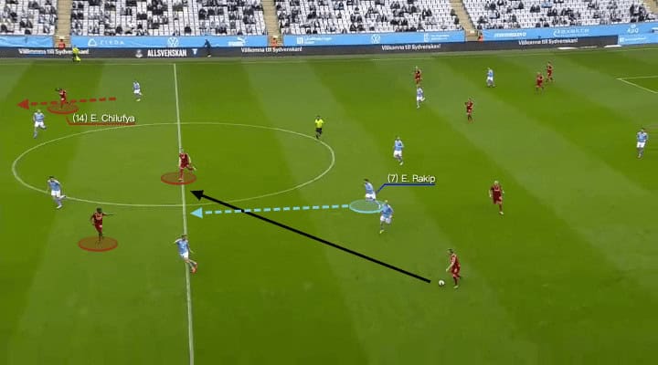 While both Asoro and Chilufya kept the Malmö centre-backs occupied, Radetinac was seemingly the free option, but this was anticipated by Rakip in advance. The 25-year-old midfielder sprinted back to intercept that pass, it was a top defending.