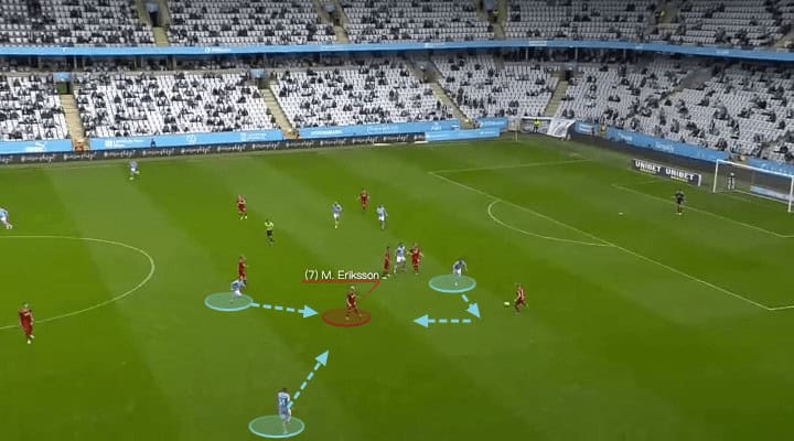 One more alternative of Malmö’s attacks here. Again, they moved the ball from Ahmedhodzic to Beijmo, Djurgårdens players also chose alternative decisions. This time, Eriksson pressed Beijmo while Schüller went up to press Rakip, so they close the midfielder.