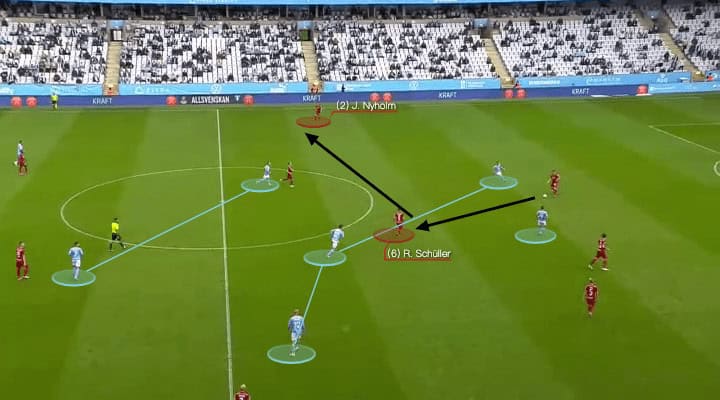 In the build-up, Djurgårdens used could use the wide full-backs and holding midfielder to exploit the 4-2-3-1 press. For example, they dragged Malmö to one side in the above screenshot, then quickly moving it to Nyholm’s side. The right-back would have some rooms to bring the ball forward.