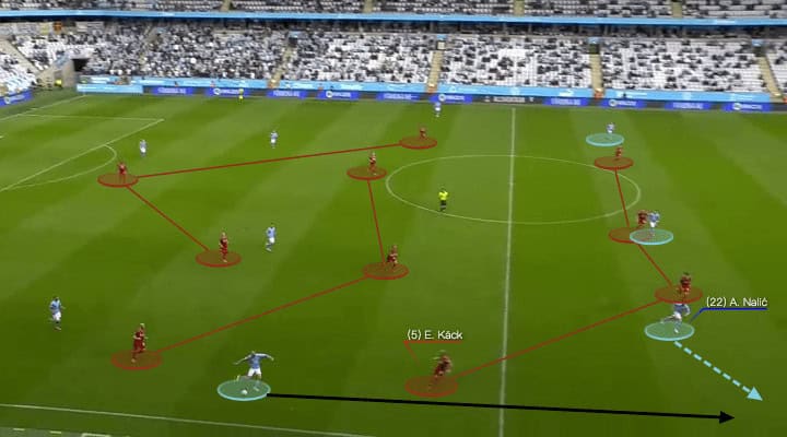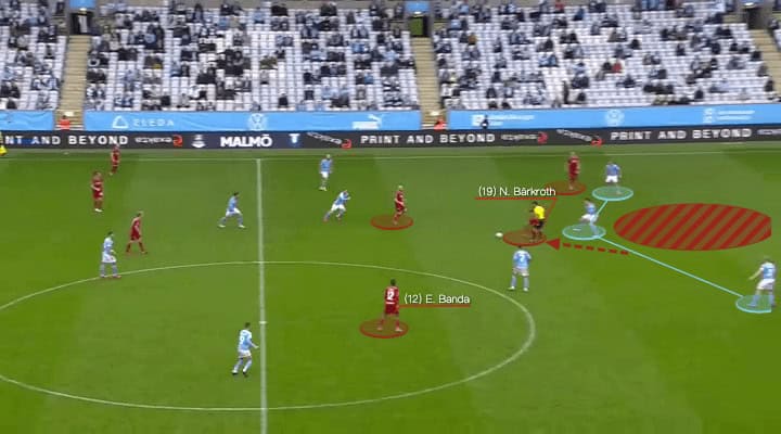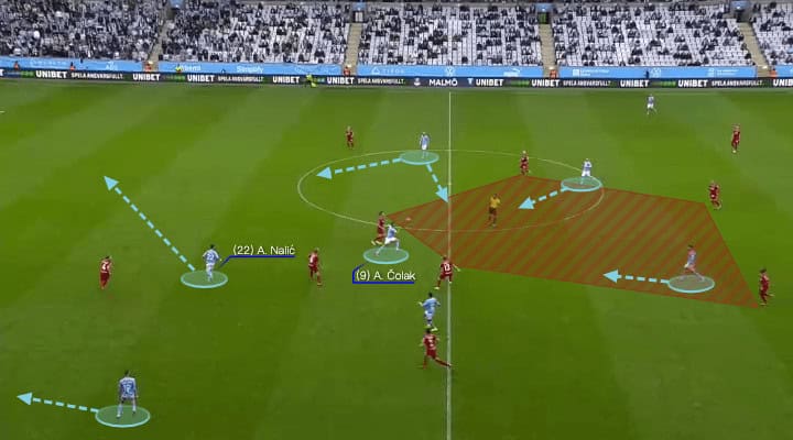 As we said, the press was always late, so Berget had the angle to release. Nalic was smart to make runs into spaces whenever the front players created for him. With these simple passes, Malmö very easily broke into the final third and they would have the chance to attack.