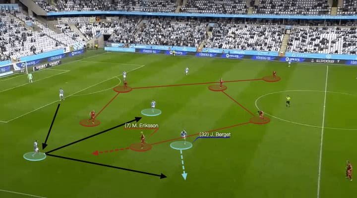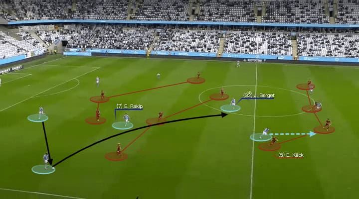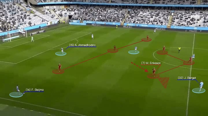 You could see Berget’s narrow position above, he dragged Magnus Eriksson down as Djurgårdens would want to shut that channel. As a result, no one could jump onto Felix Beijmo if Radetinac failed to block the outside passes of Anel Ahmedhodzic.
