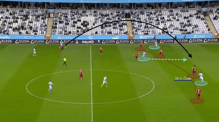 The first image shows the split movement of Malmö’s left-winger and Čolak to stretch the centre-backs, then the channel was enlarged for the deep runner to directly. As the above image have shown, the long pass was provided by Martin Olsson on the left.