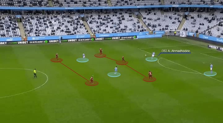 Sometimes it was a 3-1 shape, Christiansen could also drop as the right centre-back of a back three so the opponent would not jump up to mark him. But in a 2-2 shape, Malmö would not risk at going into tight spaces. Instead, diagonal switches from Ahmedhodzic was their strength.