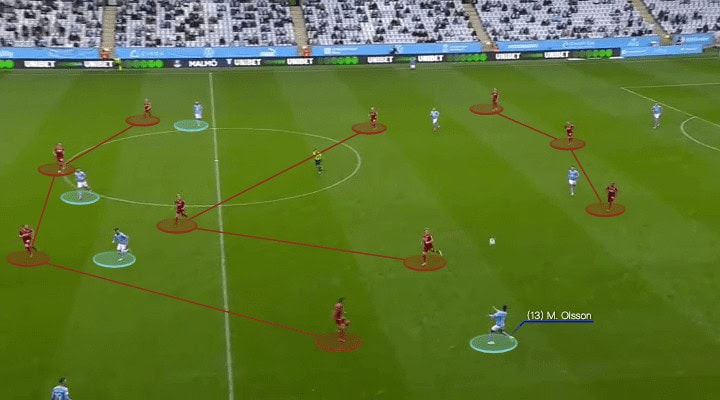 In the above image, the red zone demonstrated spacing between Djurgårdens players. They were lacking the intensity to recover those spaces, so even Čolak struggled to chest the ball down comfortably, other Di blåe players could support. Also, Malmö had runners from many angles to attack the disorganized backline, just one overhead pass and they would be entering the final third.