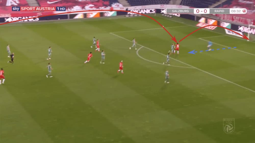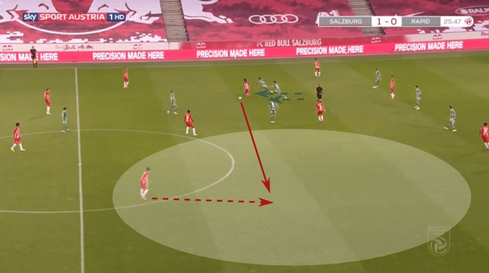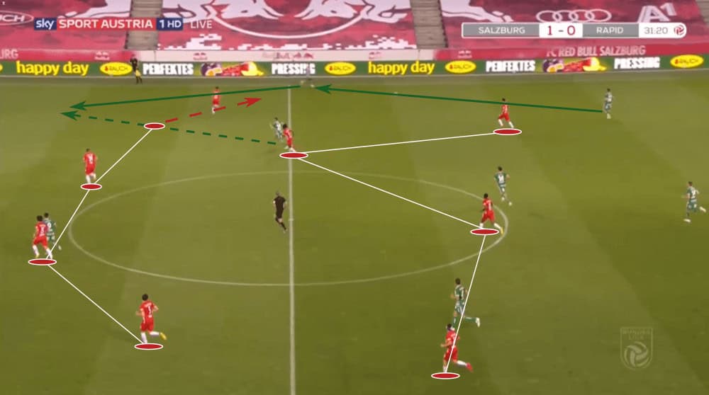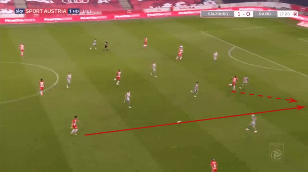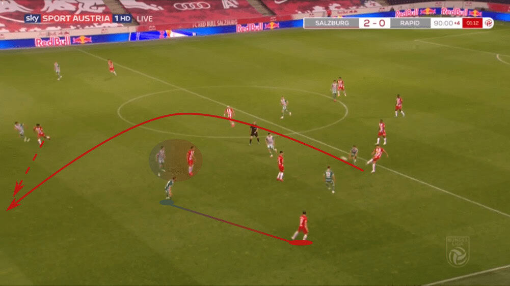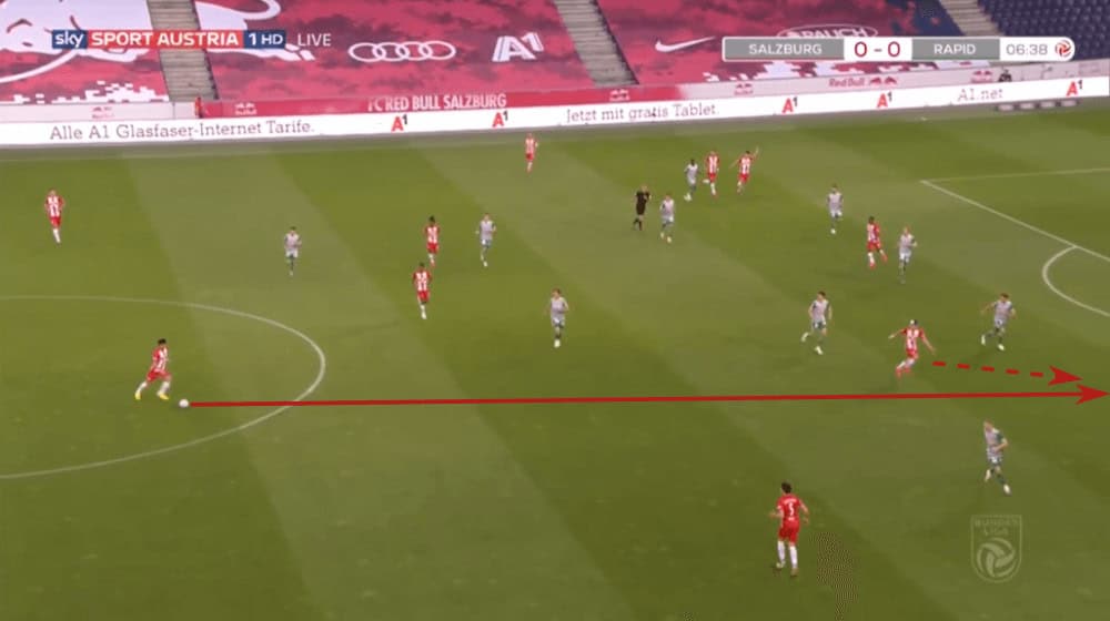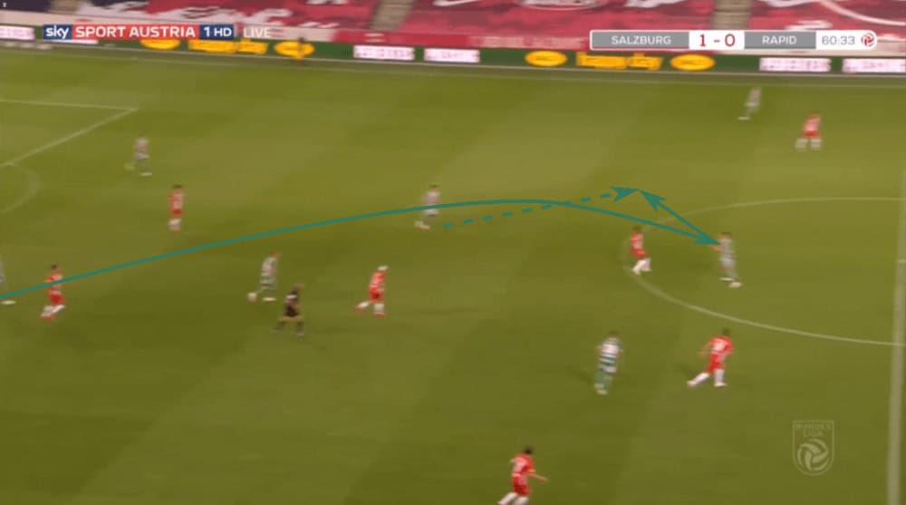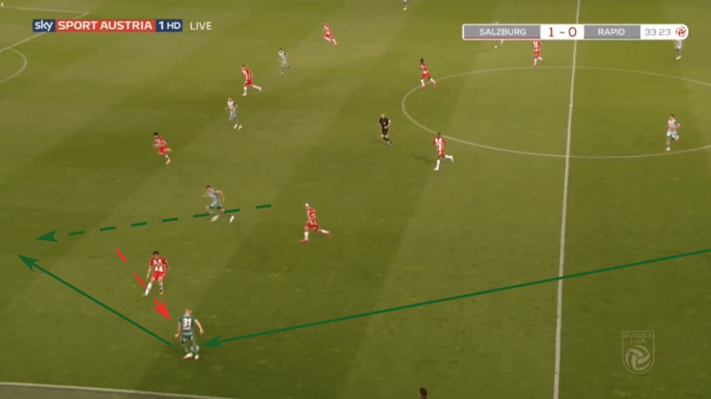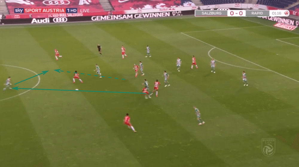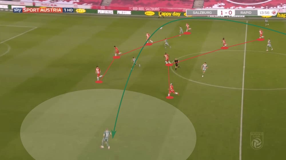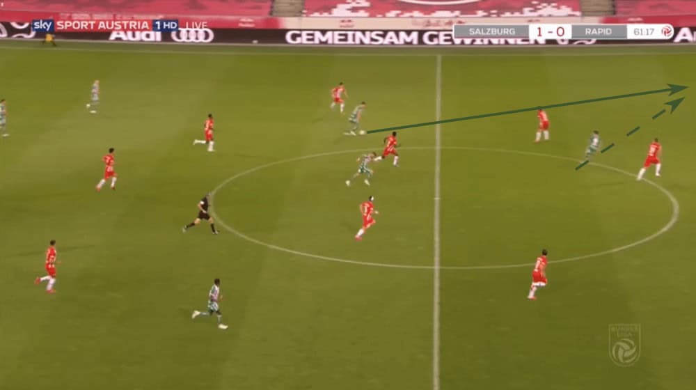 Due to that, Rapid Vienna often played to one side to force Salzburg shifting to that wing, just to then switch the side with one or two passes since then again, the wing-back had a lot of time and space. An example can be seen in the shot below.