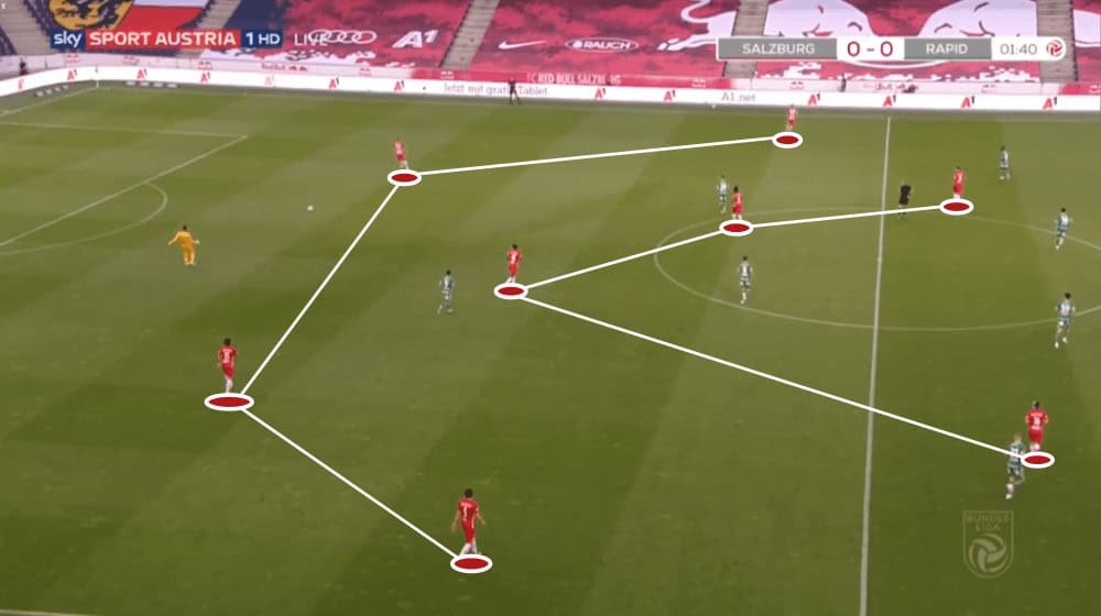 When you watch RB Salzburg regularly you quickly notice that they almost never play with real wingers. When they use a 4-4-2 as they did in the first 36 minutes of the game, the wingers tuck in and the full-backs should provide width. If they play in a 3-5-2 formation as they did after the switch in the 36th minute, the wing-backs are the only two men who occupy the wing.