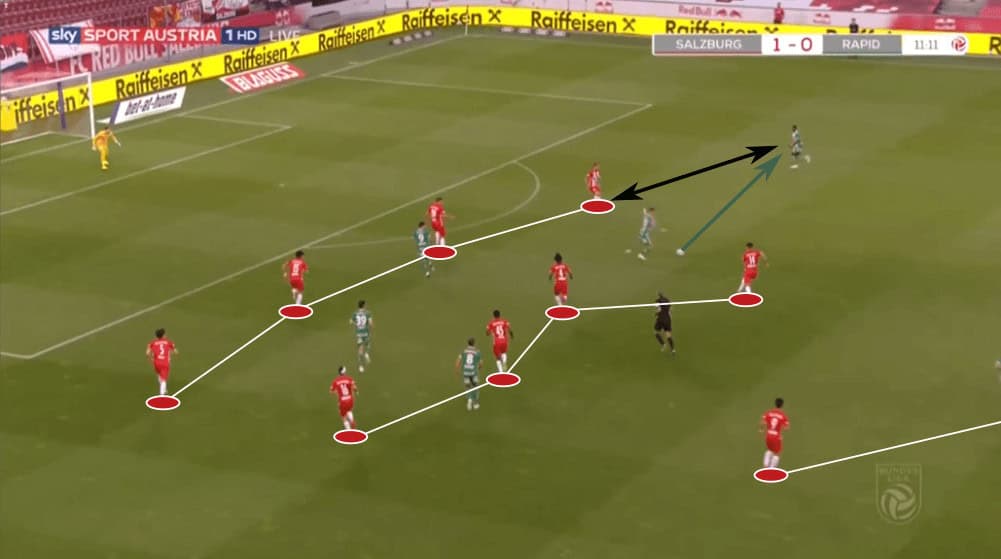 Since Rapid Vienna were quite strong in this match, Marsch decided after about 36 minutes to switch to another system. The main problem was that Arase and Ullmann often had quite a lot of time when they received the ball due to the numerical advantage (5vs4) of Rapid in the highest line.