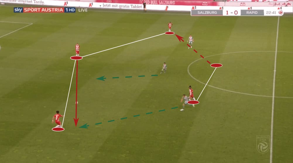 Another part of RB Salzburg’s tactics which was in this game really central were the counter-movements of the four players in the highest line (two strikers and two inverted wingers). We could permanently see that one of them dropped deeper, lured out one of the opposing defenders and then a teammate started exactly in that free space.