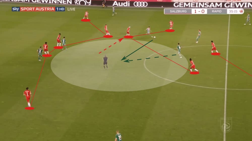 Considering these aspects, Rapid wanted to find one of their wing-backs as soon as possible since they had the most space and time due to RB Salzburg’s compact formation. Logically, Salzburg shifted extremely quickly towards those men as soon as they received the ball.