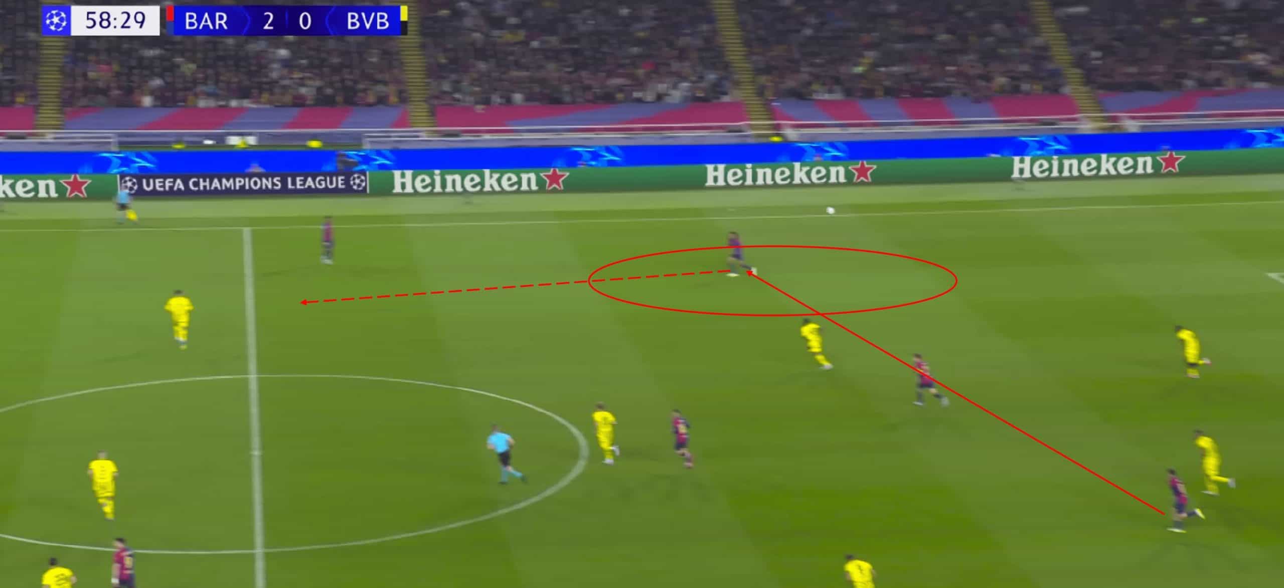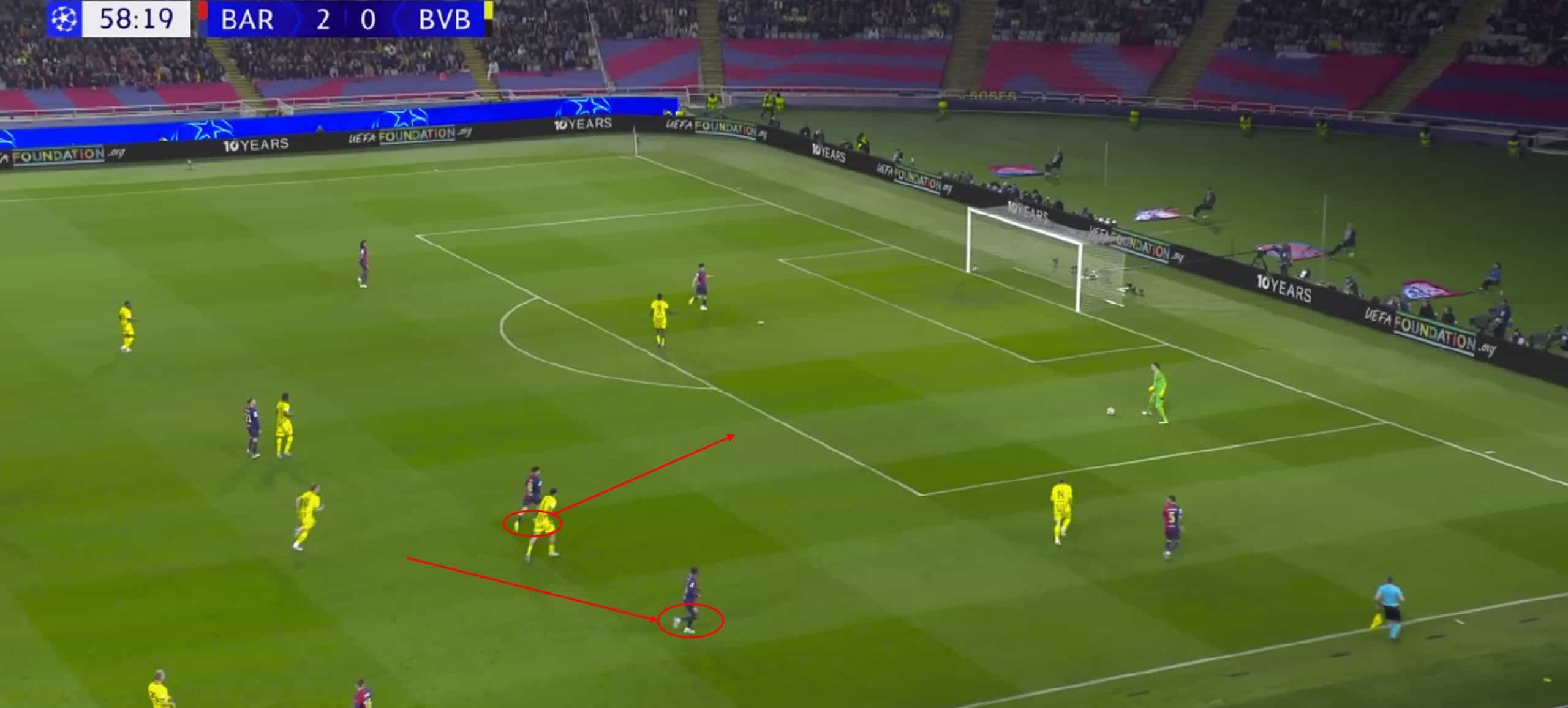 Pedri has enough time to control the ball and just play the switch to Koundé here, which again has Dortmund trying to recover their lost position.