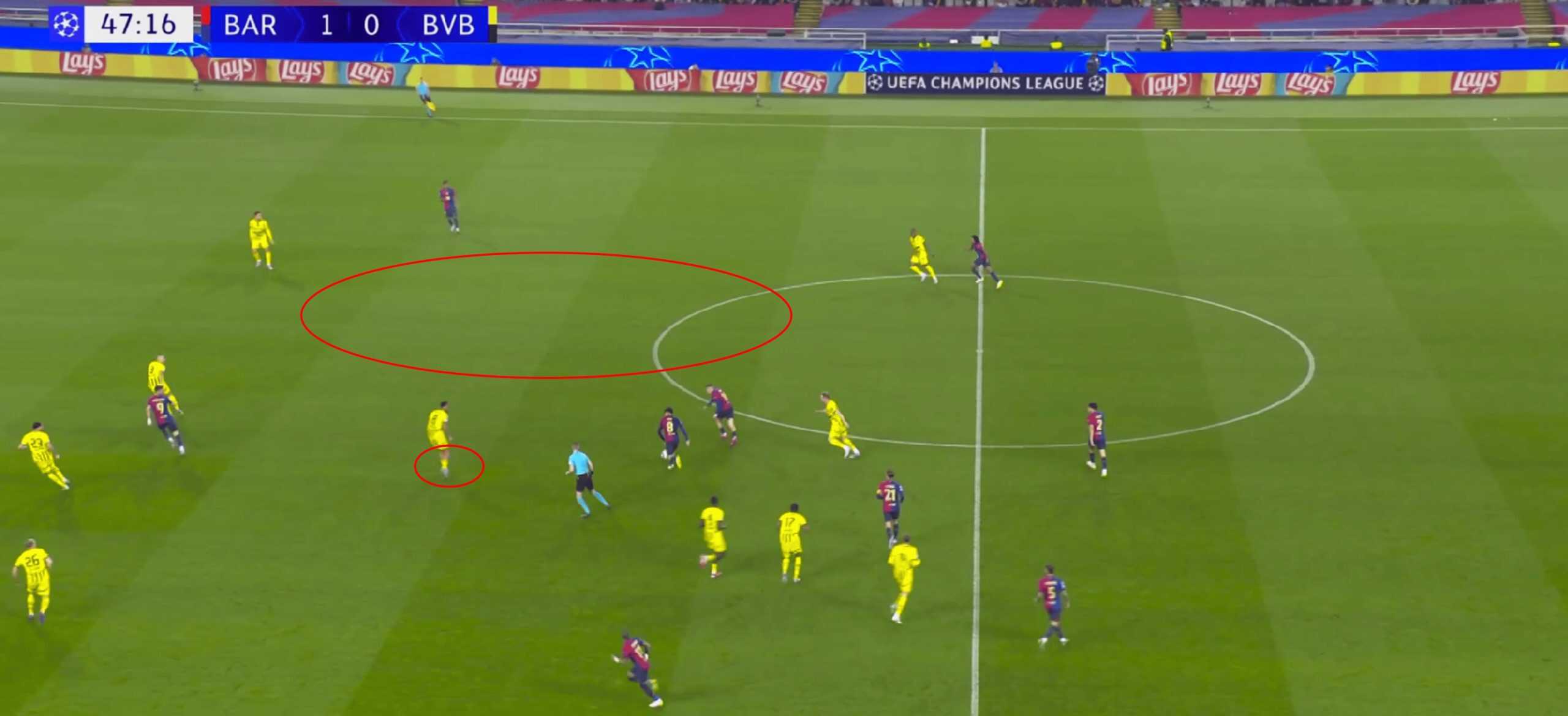 Dortmund lose the ball here, and Barcelona are able to recover possession easily.
