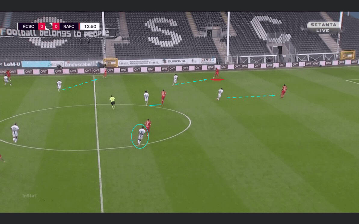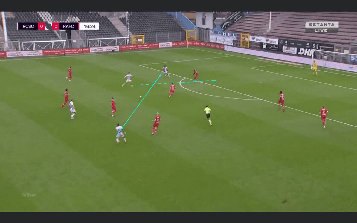 The midfield box didn’t only allow a numerical advantage but also a positional one. Refalelov and Gerkens would position themselves in the half-spaces behind the opposing wingers. This would result in Gillet and Ilaimaharita taking up a position more to the sides due to the man mark intentions. Consequently, the centre opens up and facilitates central penetration or even wide overload opportunities.