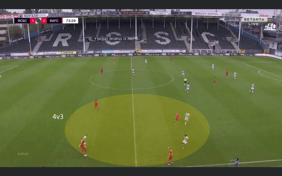 Not only centrally overloads were created by Antwerp. Also on the flanks, The Great old tried to be creative in their positional play. The image below shows their numerical advantage in a rather static way. In this case, making it dynamic would give them a chance to attack in depth.