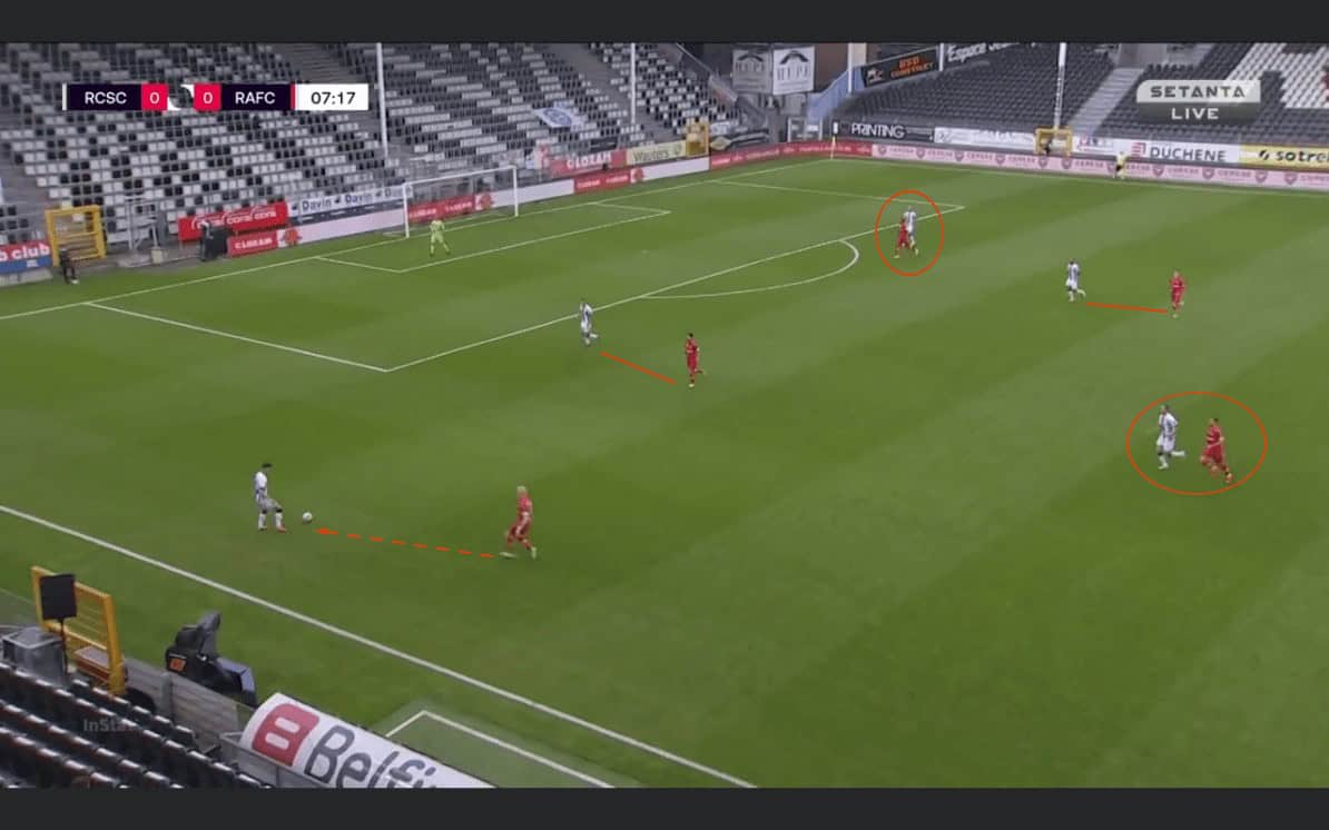 The right pressing trigger was when the outside centre-back would receive the ball. An example below. Once the ball was played to Antwerp’s outside centre-back, a man-oriented press would occur to the side. The key laid in the lack of urgency in the early stages of the game. If Antwerp is allowed the time, they could play out. And Charleroi missed the urgency once the pressing trigger occurred. Predominantly because the centre-mid had to cover to close down the fullback due to the overload Antwerp tried to create on the flank. This is also clear in the image below.