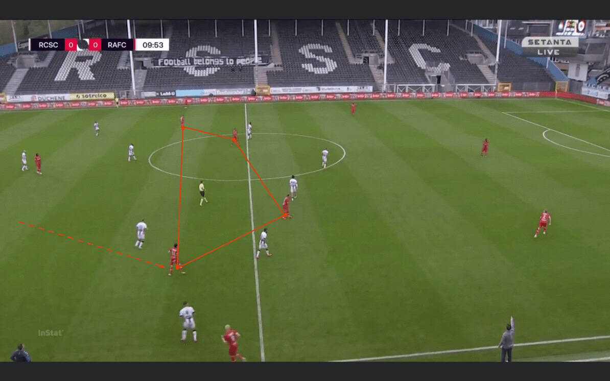This was Antwerp’s gameplan before the game. Leko chose for a box midfield in order to overload this area as seen below. Refaelov would drop from advanced areas to make this possible.