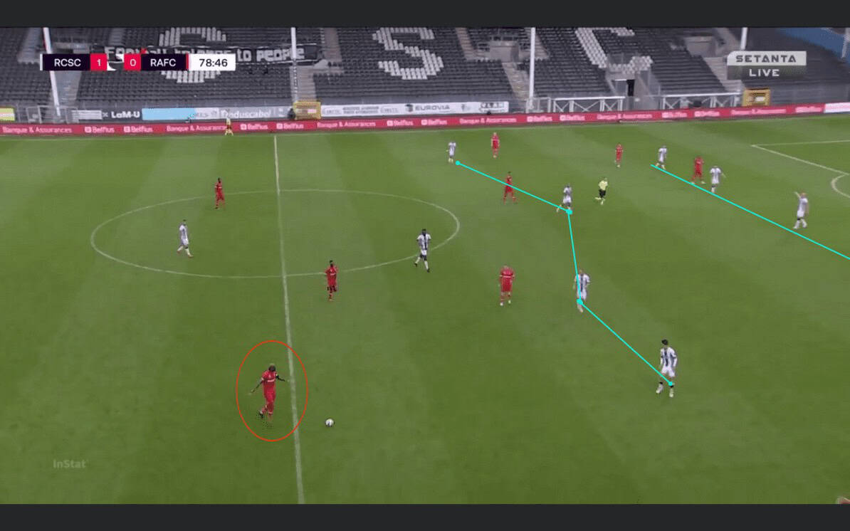 In the below image, we can see Antwerp’s man orientated high press. Whilst Juklerod jumps and leaves the opposing winger free, he can initiate the side press. Whilst Antwerp did play with a back five, the backline could shift to one side and mark the ball side winger without worrying about ground getting uncovered on the far side in the last line. All the other options in midfield and attack were closed off by the Antwerp players. This resulted in a more direct approach by Pennetau playing 18 passes beyond his own third, thus using a more direct approach.