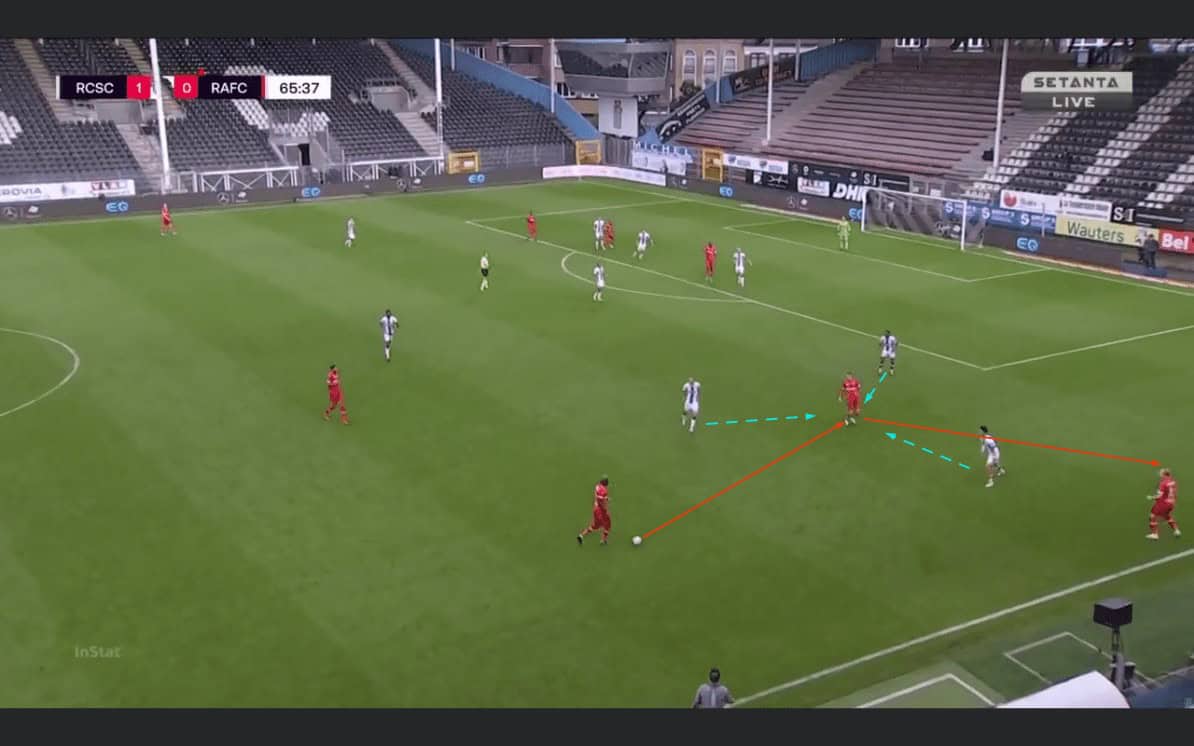 Antwerp’s urgency was also in possession. After just 20 minutes into the game, Antwerp were reduced down to ten men. Despite this loss, the game ended with Antwerp having 51 per cent of the ball during this game. By creating overloads in certain key areas on the pitch, Antwerp could still hold possession and try to find a way through.