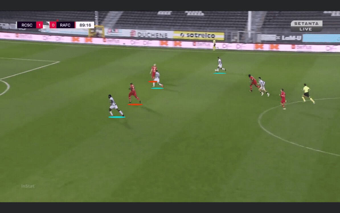 But the counterattacks weren’t always effective. Charleroi completed a total of nine transitions from defence to offence. The positioning of the players in the vertical lanes were right to create a successful transitional moment. But the lack of unselfish movement to create space for a teammate was missing. Meaning that runs into depth without receiving the ball and attract any defenders and create space and time for the ball carrier was missing. For instance, in the example below, The strikers run in a vertical line straight forward movements causing a lack of distraction for the two Antwerp defenders. Which consequently results in a loss of the ball.