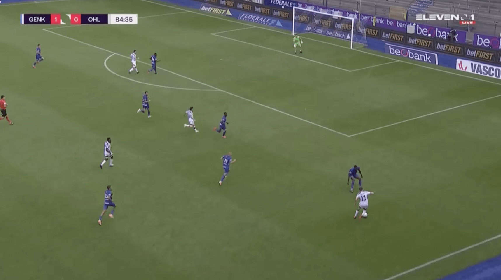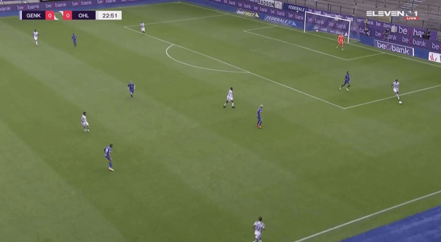 Out of possession, Leuven had two systems, as indicated previously. For the majority of the match, when the game was 0-0 and shortly after Genk took the lead, Leuven dropped off Genk. The drop off consisted of a mid-block at it’s highest and a drop to a low-block quickly. From there Leuven did not engage the player with the ball and only pressed to block passes once the ball carrier had travelled past the edge of the centre circle in OH Leuven’s half. The shape was frequently a 5-4-1 or a 5-2-2-1. As stated, OH Leuven man-marked, rather than pressing the ball. This worked for them as they were tough to break down and often the ball carrier, usually a centre-back, only had options to the side, rather than being able to penetrate. If Genk did work a shooting opportunity then it was usually from outside the box, with multiple bodies between the player and the goal, including the goalkeeper. To add, the shooter was normally a defender or more defensive midfielder, rather than the most potent Genk players.