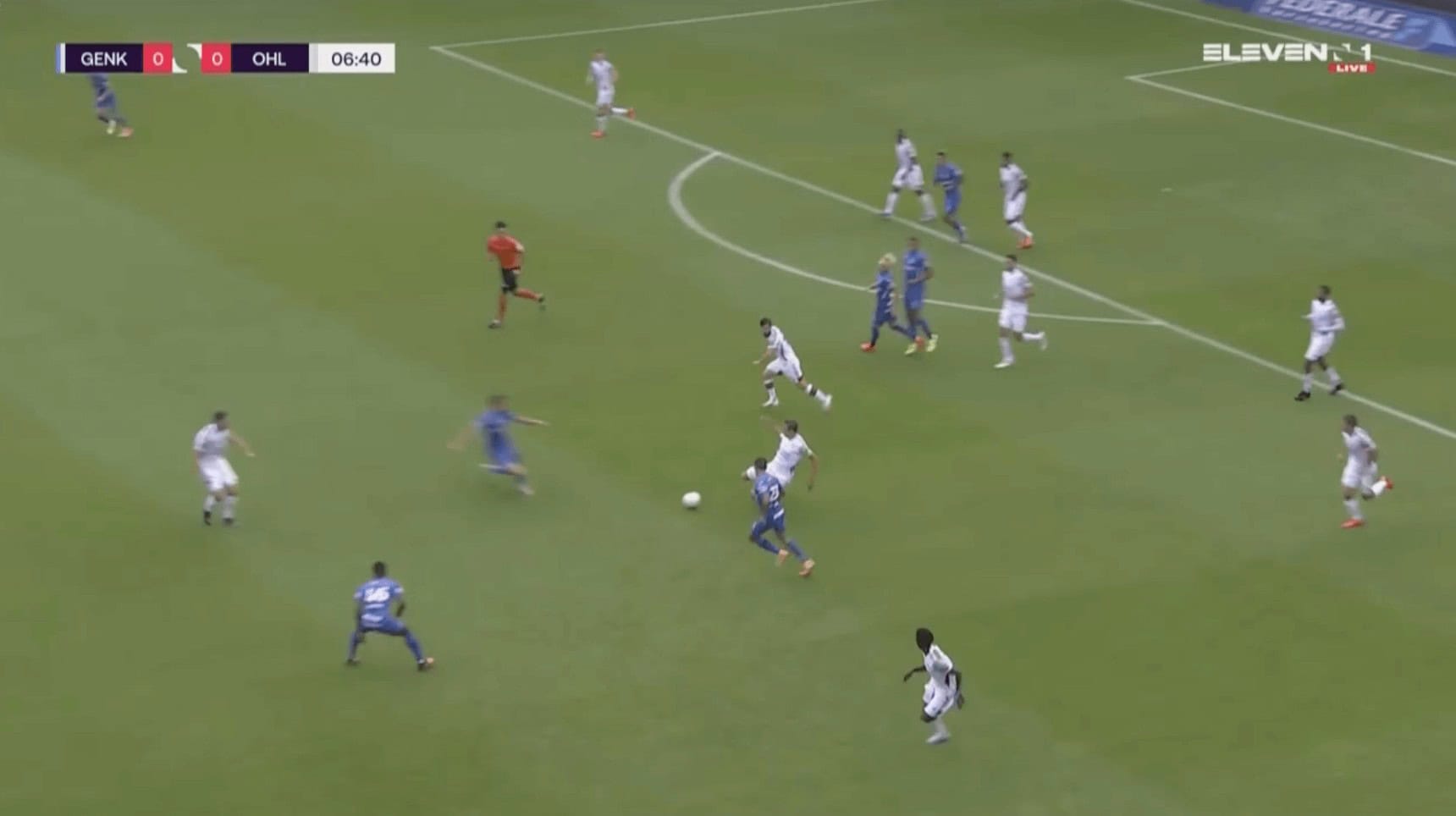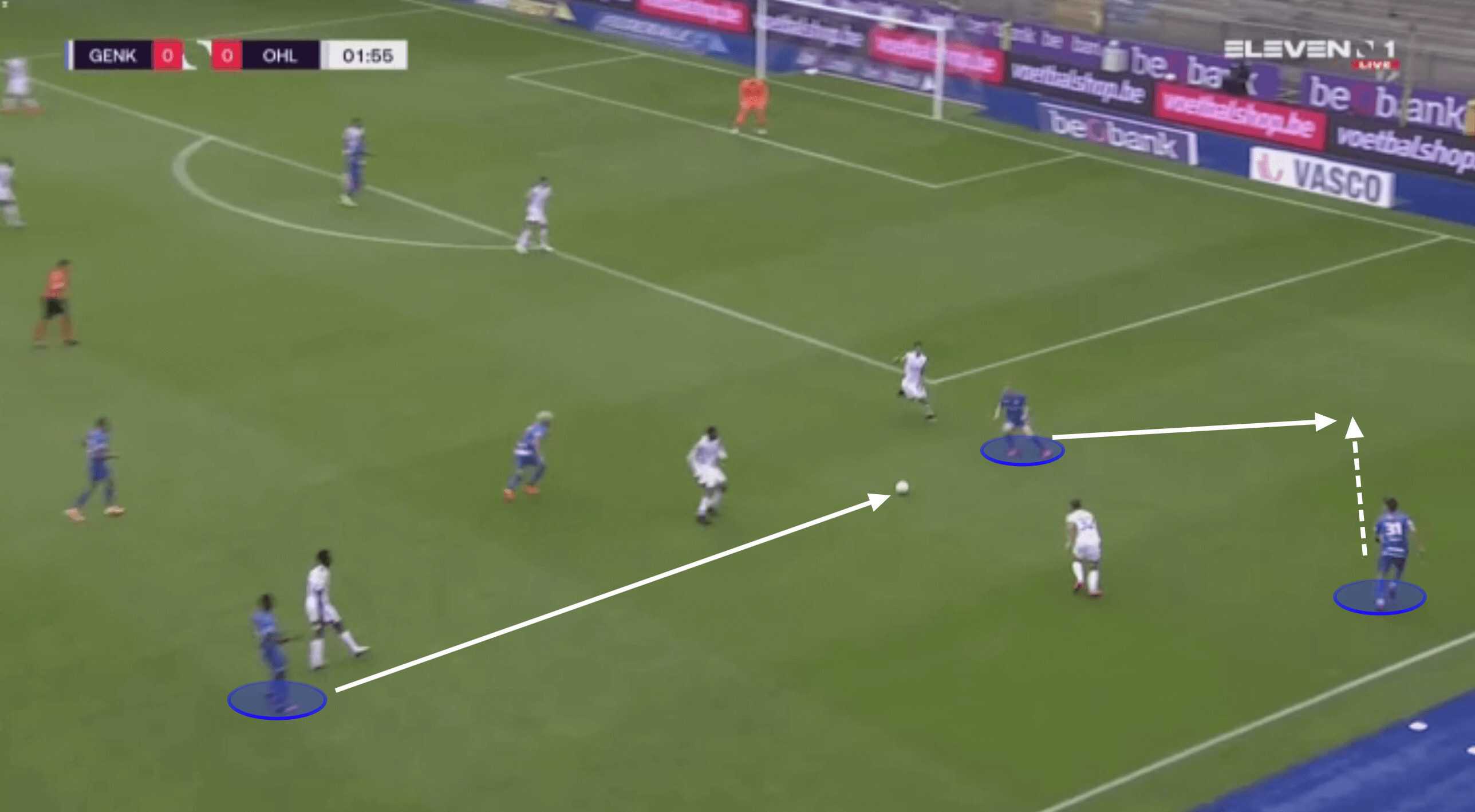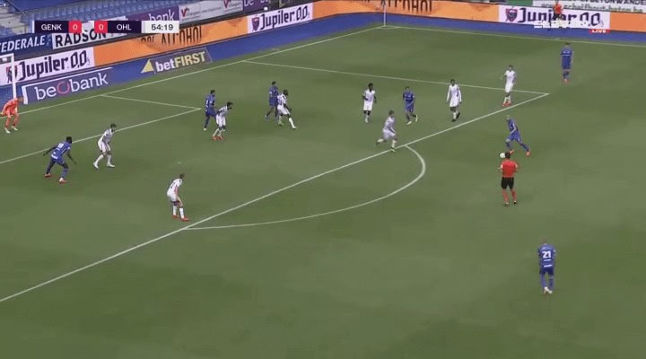 In possession, Genk essentially played with a 2-5-3, with their full-backs pushing in into midfield and beyond. Their play was fluid and flexible, with players interchanging positions. Rather than sticking to positions, Genk were happy to rotate, as long as each position and zone on the pitch was covered. This was needed due to the low block tactics of OH Leuven until the first goal, this will be discussed shortly. Genk’s attacking players often had to play with their back to goal and drop to try to pull defenders out of position, this led to lots of layoffs or flicked balls around the corner to find free runners. A frequent tactic of Genk was to play balls down the channel between the left centre-back and left wing-back of OH Leuven, this was done via one pass if possible, or via a flicked pass around the corner from a dropping attacker. To try to stretch the opposition’s backline, Genk’s full-backs played on the edge of the touchline when in possession, attempting to pin the Leuven wing-back or wide midfielder before making overlapping runs for channel balls prior to crosses or cutbacks. Genk did have a goal disallowed in the second half after effective channel play, but the scorer was just offside.