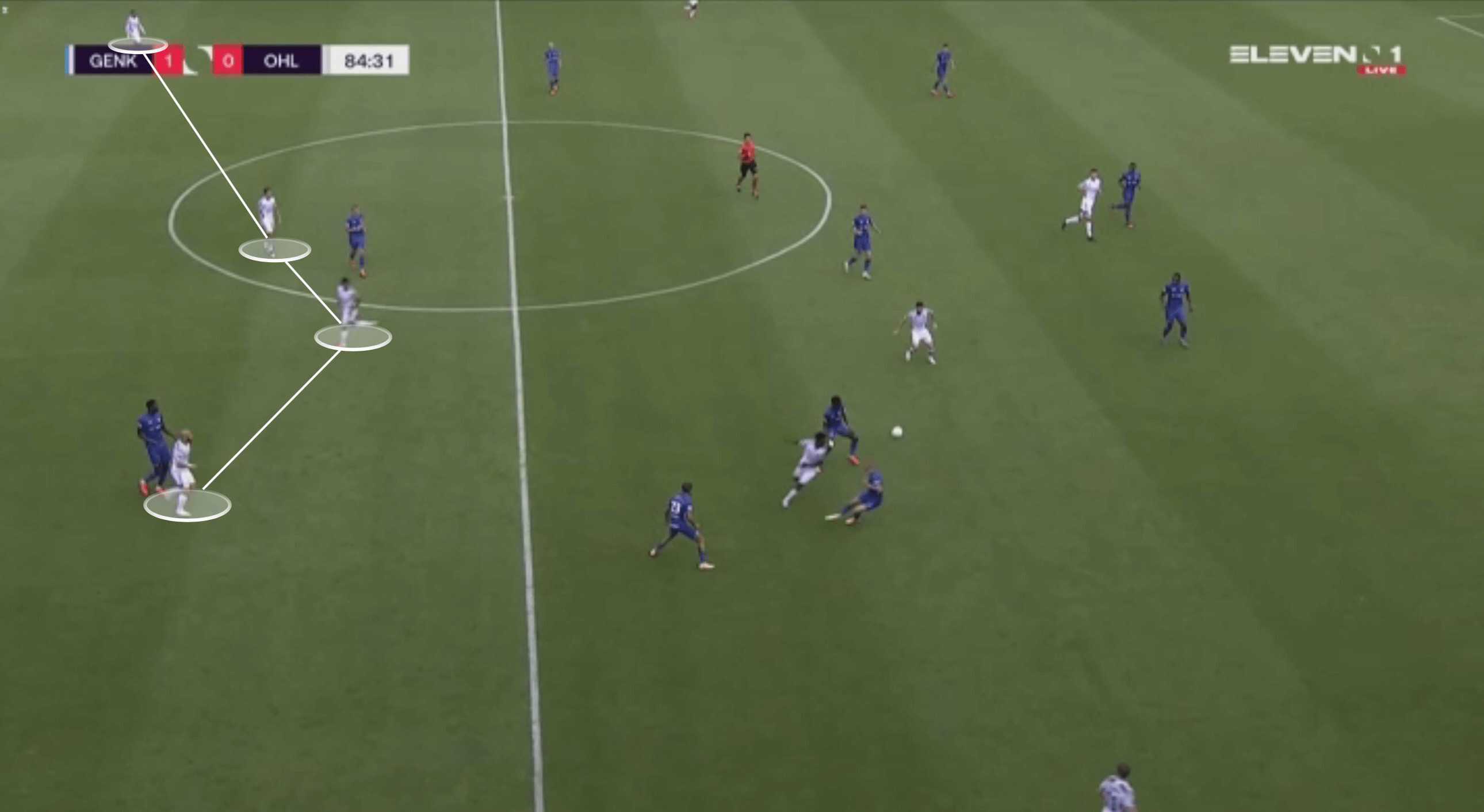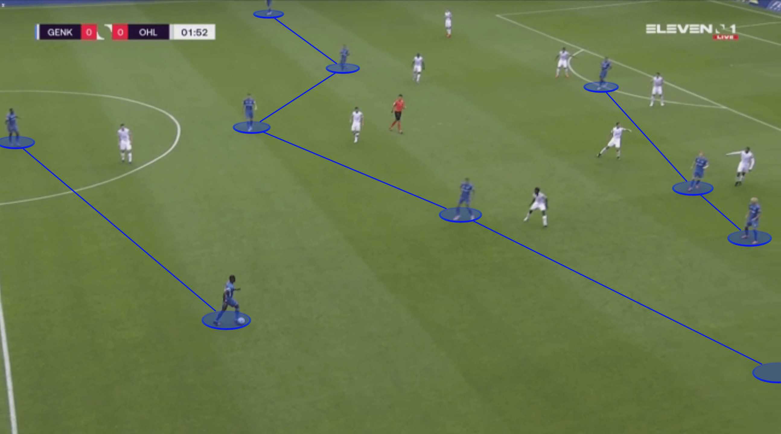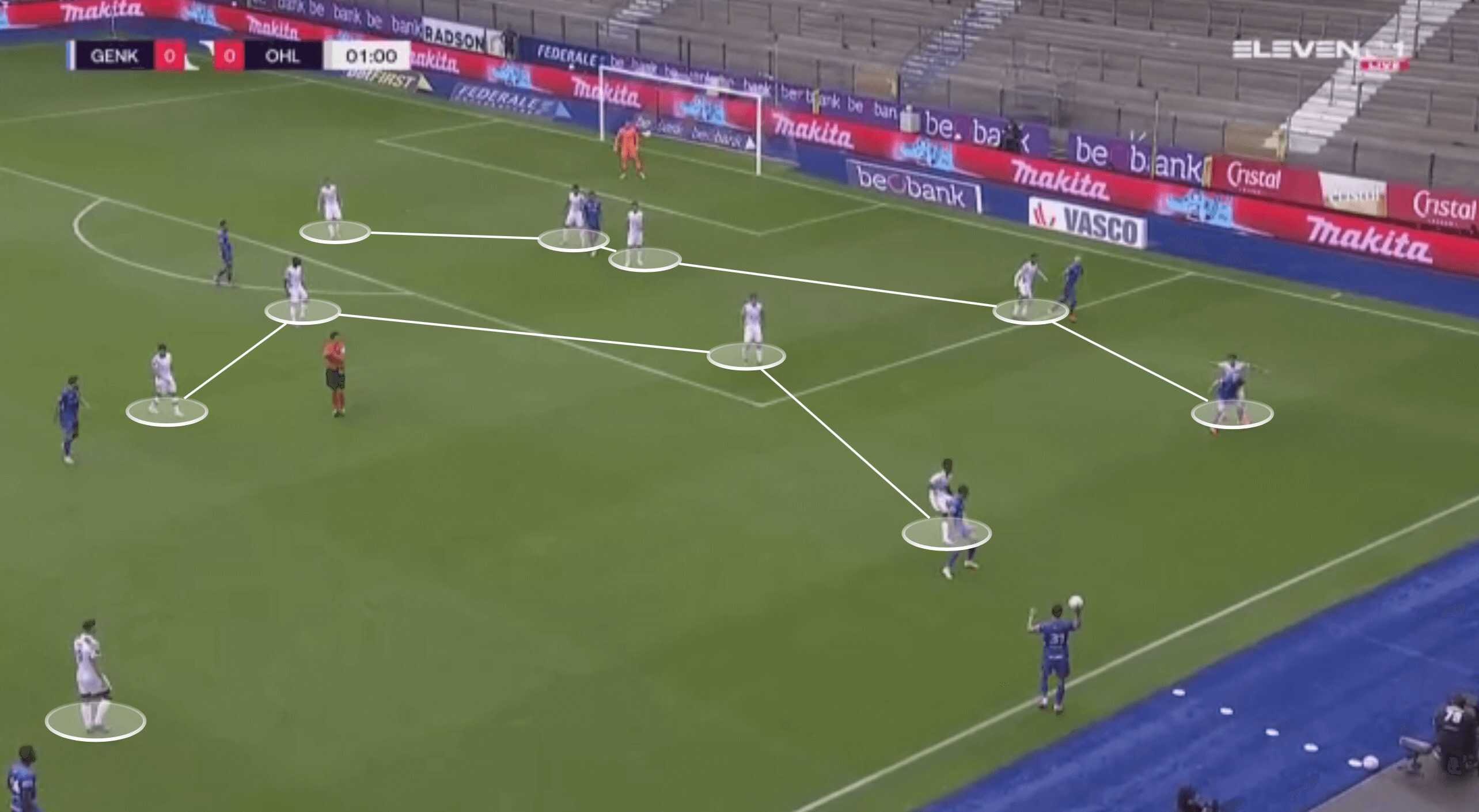 On paper, Genk lined up in a 4-2-3-1 formation, while OH Leuven opted for a 3-5-1-1. However, both teams were rarely in such a formation, with possession sequences, offensive and defensive transitions and out of possession moments dictating how each team set up to break down the opponent or nullify attacks. Such complexities will be discussed in each relevant section.