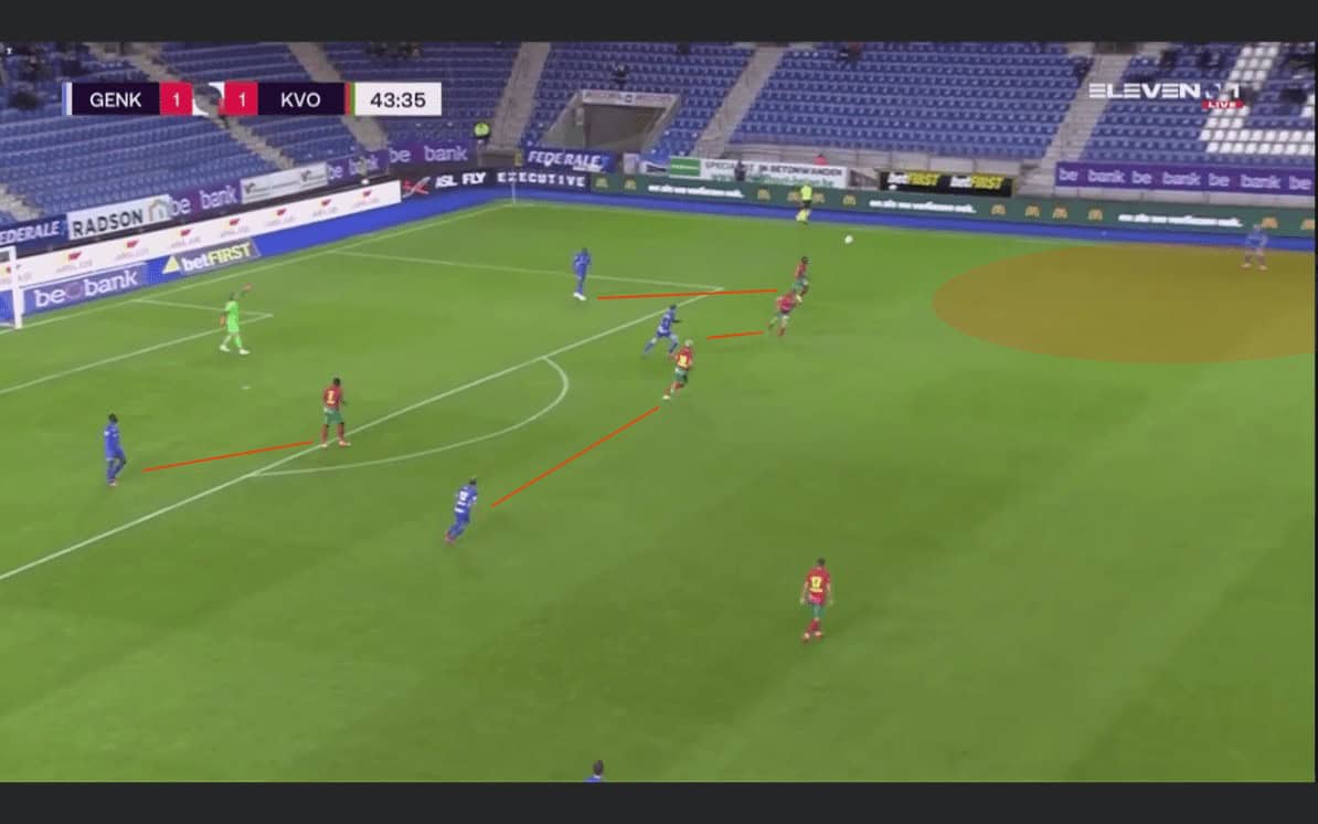 As Blessin has worked as a youth coach in one of the clubs most famous of their high pressing intensity, the German coach also applies this high pressing intensity at Oostende. Their overall PPDA rate during this game was at an impressive 5,3. This means Blessin’s men were constantly chasing down the ball once they lost it and more importantly not allowing Genk to play out of the back. Oostende’s pressing system did get exposed often, this allowed Genk progress through the thirds from the back. Some positional mistakes were the reason for this happening.