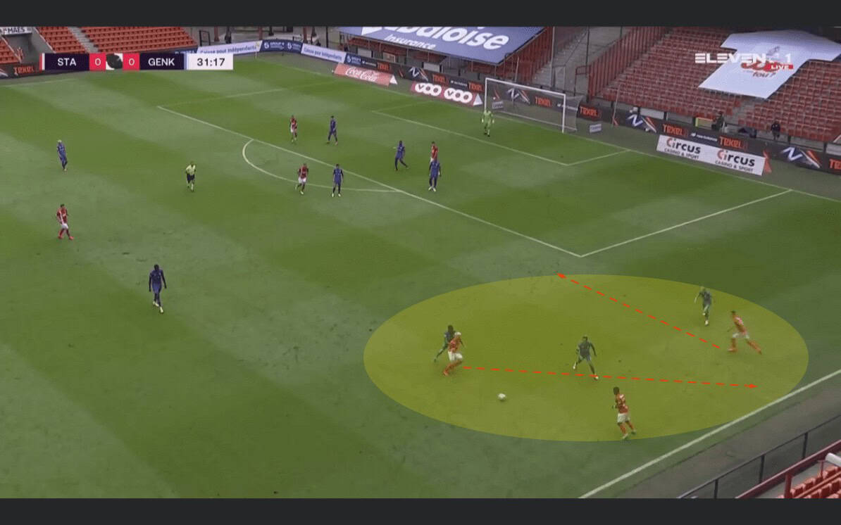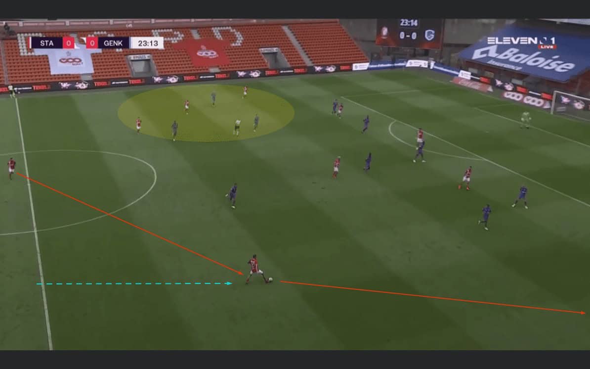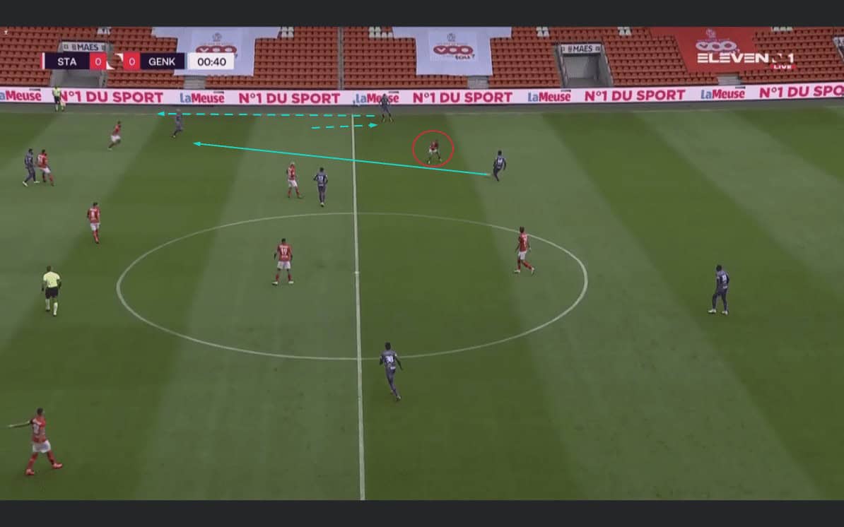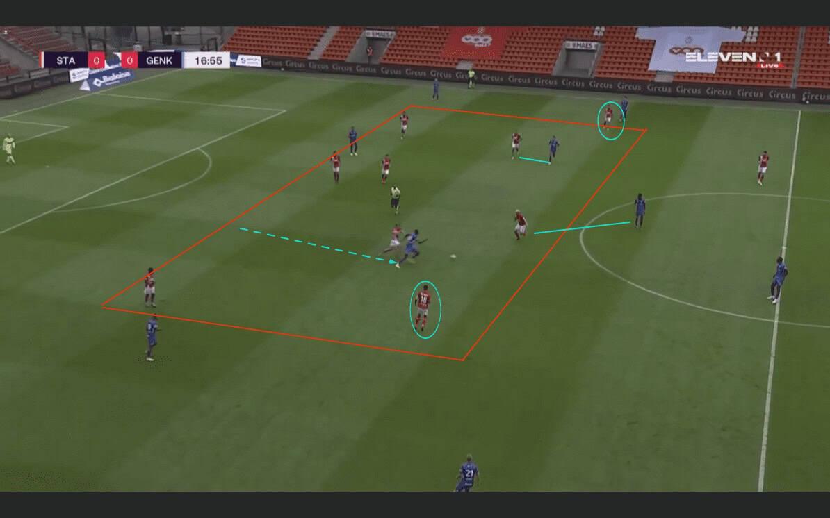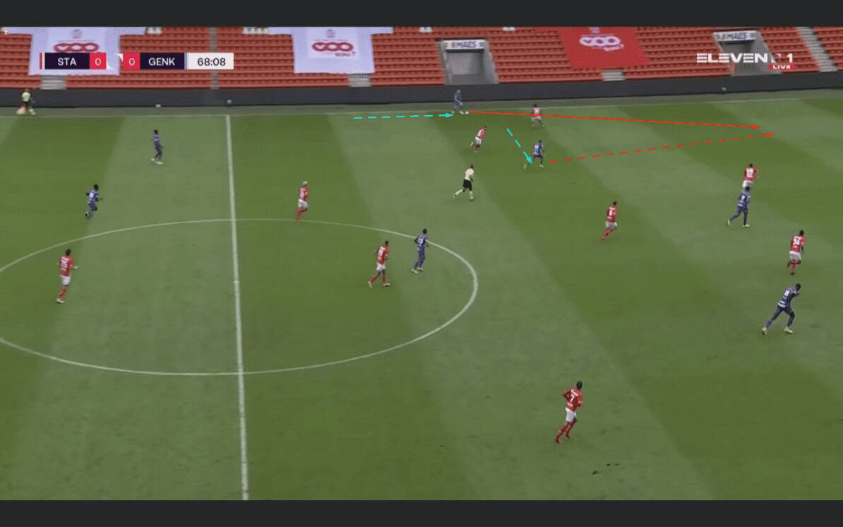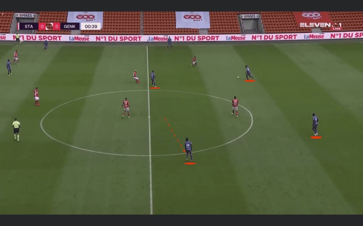 Standard Liege noticed the success Genk were having with these wide dynamics. As a consequence, Montanier opted to keep his wingers inside to close the passing lanes to the wingers. This resulted in the passing lane to the full-backs opening up. Following a pass from the ball carrying centre-back to the full-back, the winger could penetrate in the half-space and receive the ball behind the last line. The solution lied in a central player pressing the ball carrying centre-back and thus nullifying the wide overload.