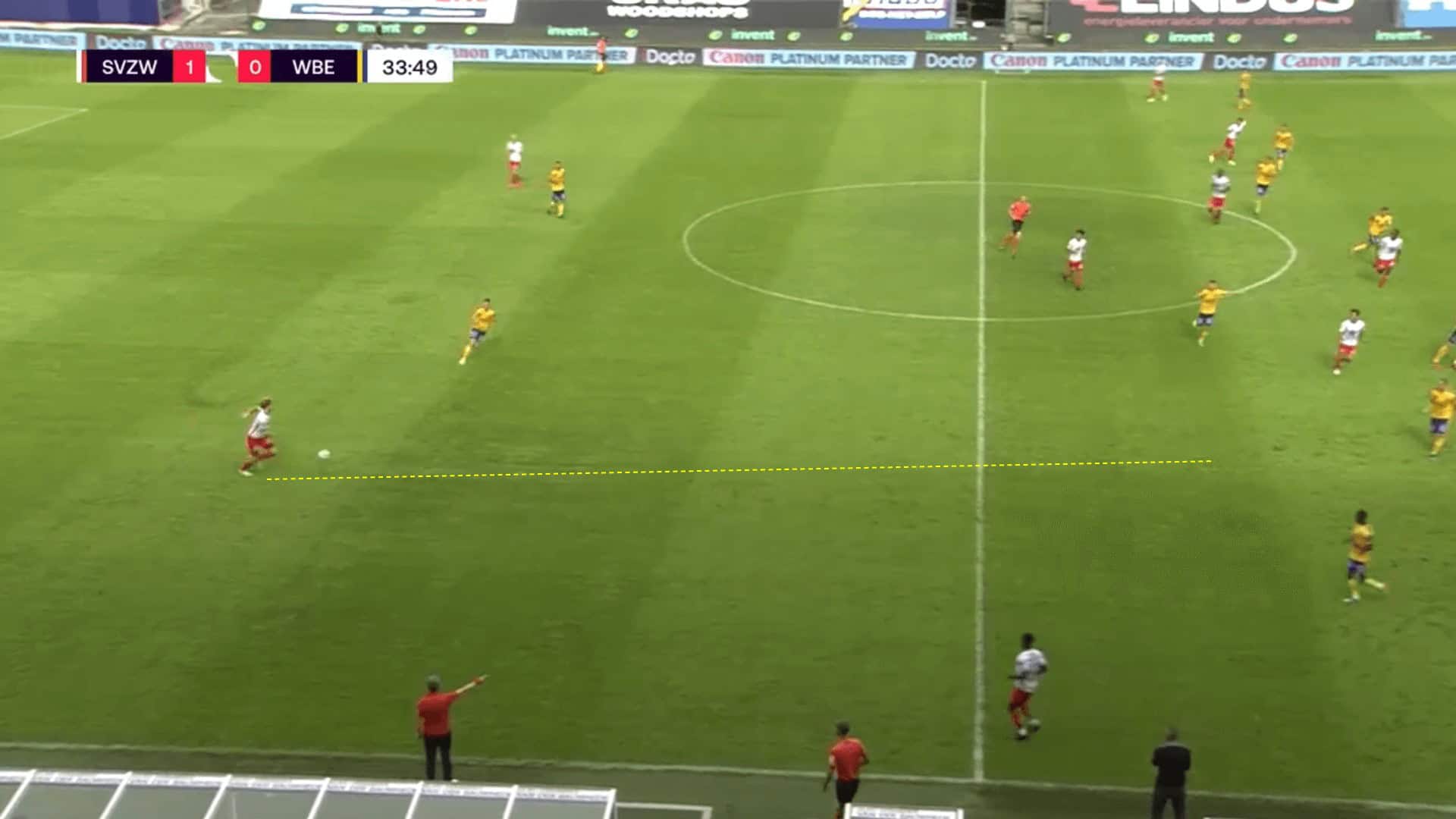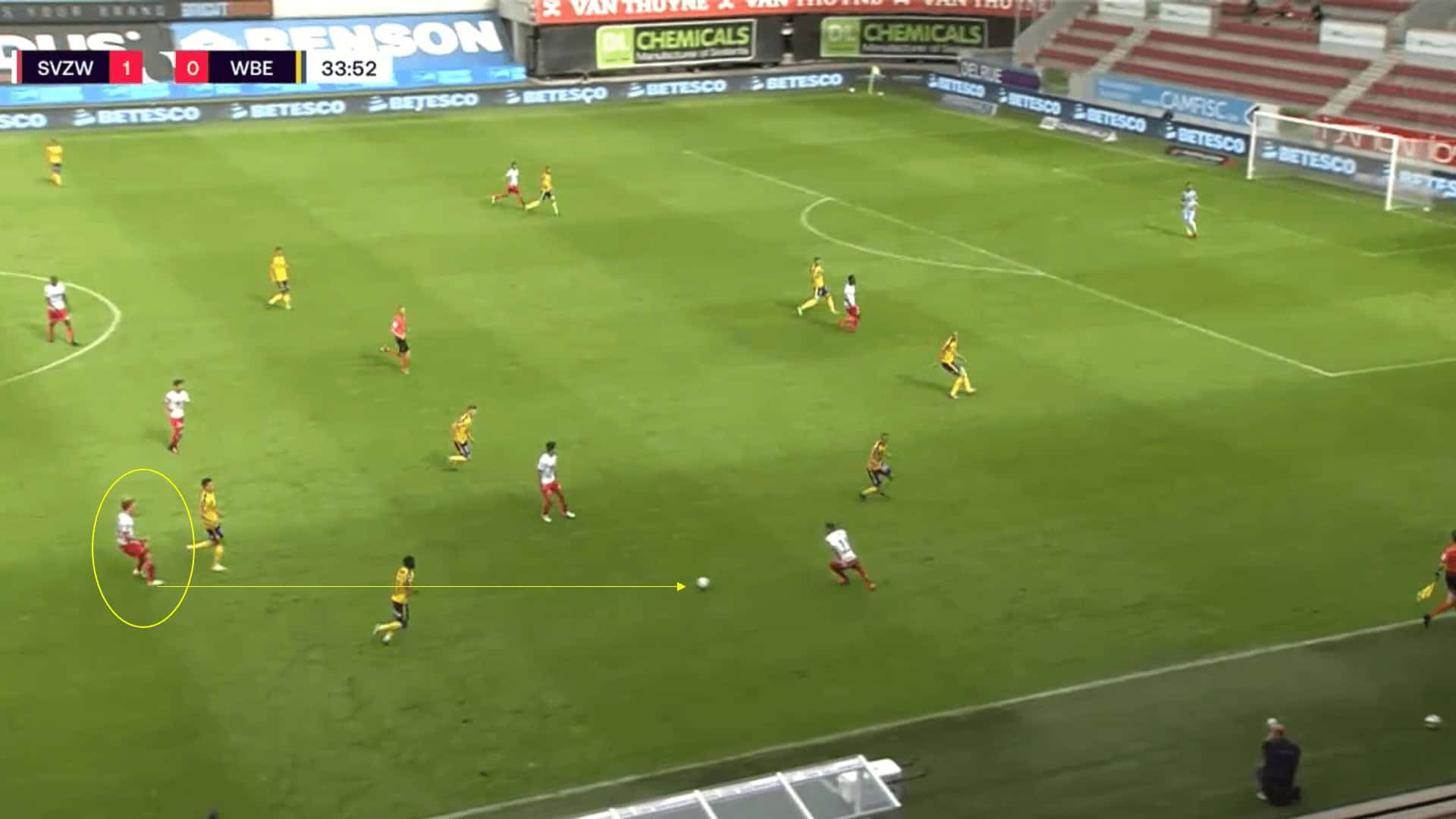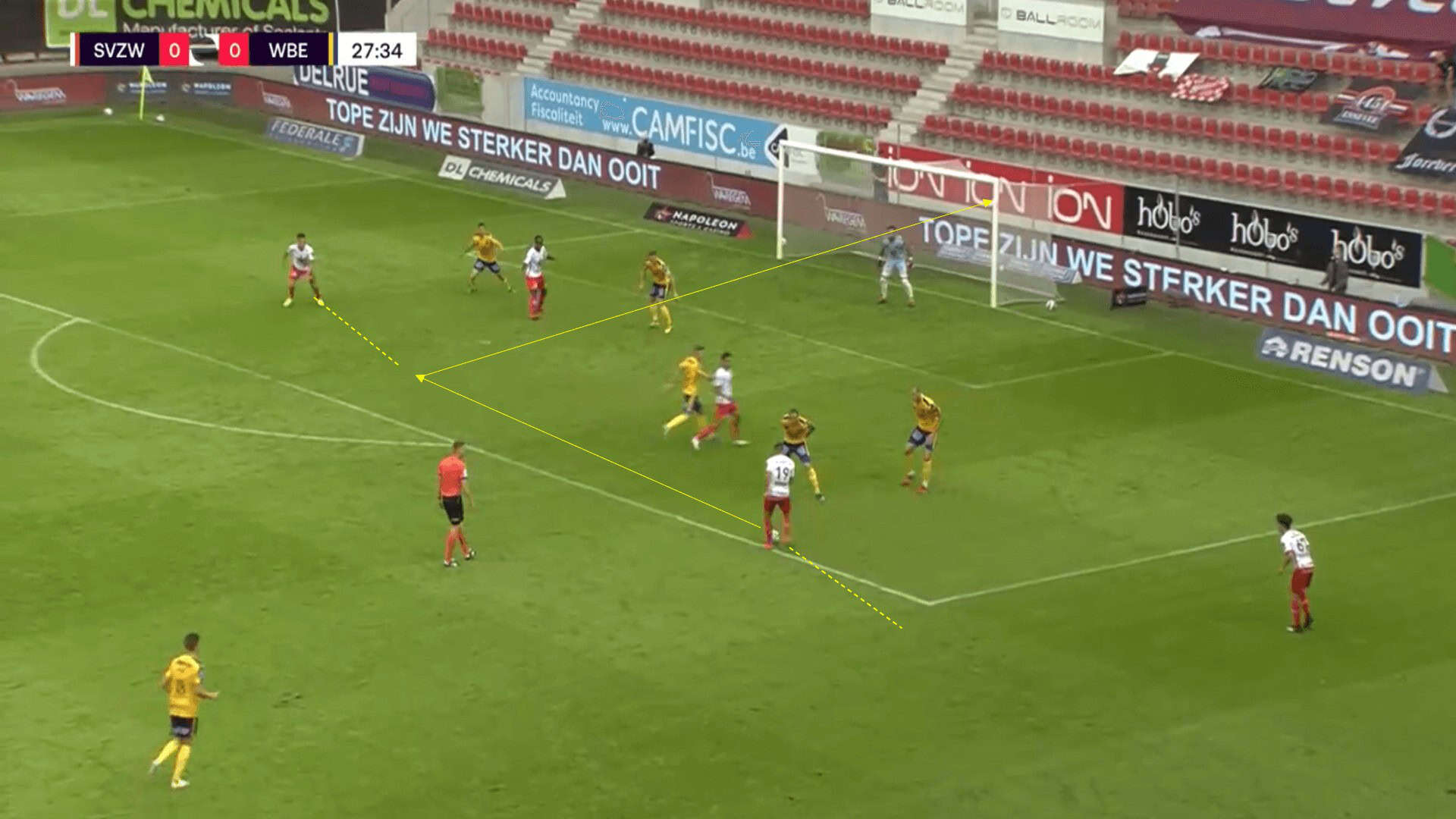This opportunity happened in the second half because of the press by Beveren being higher, which opened up more space in behind their defenders, meaning Zulte were able to exploit this. Beveren had to change something after going 2-0 down; unfortunately for them, it played right into the hands of Zulte, who were able to exploit it in order to put the game beyond the away side.