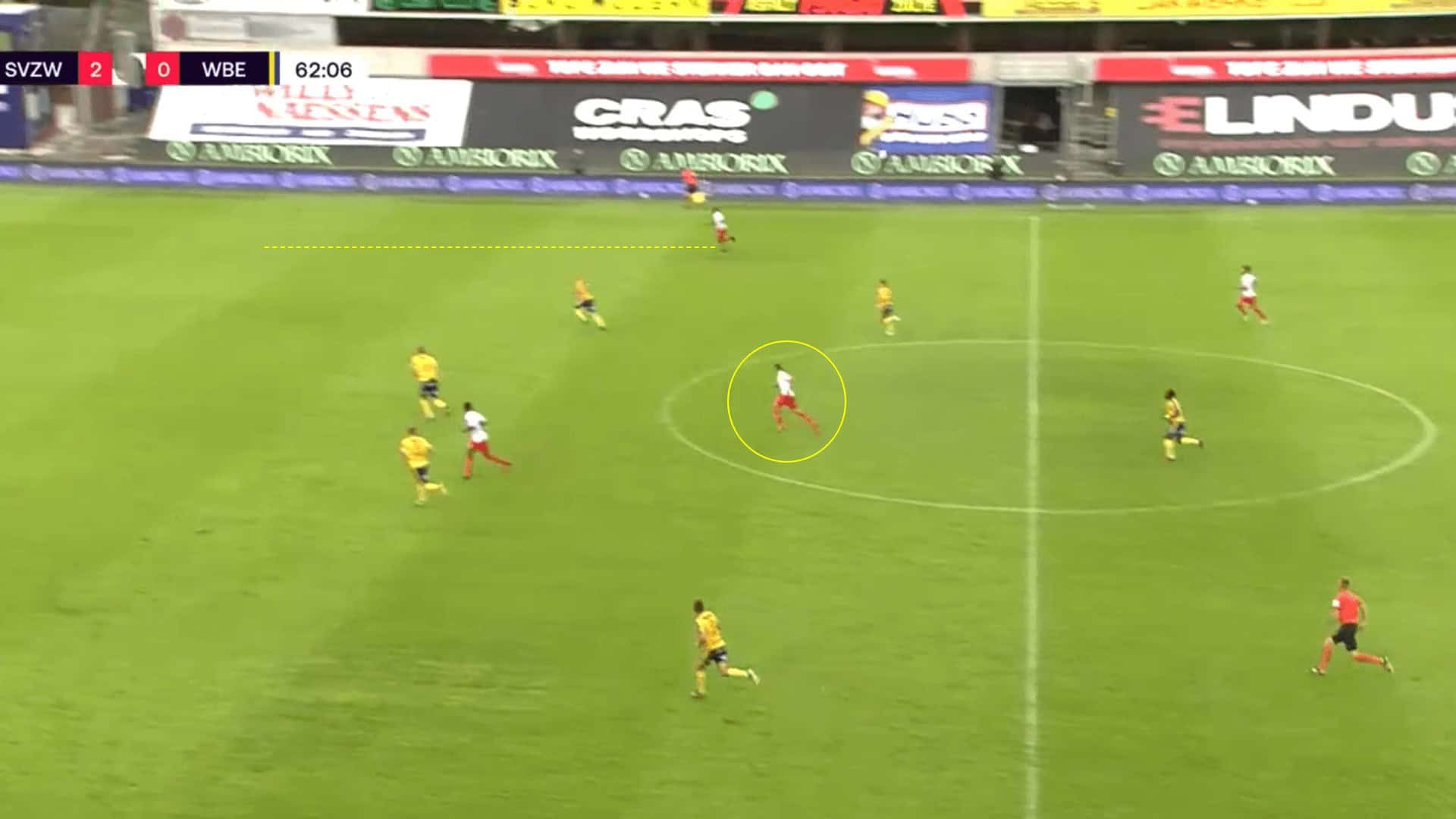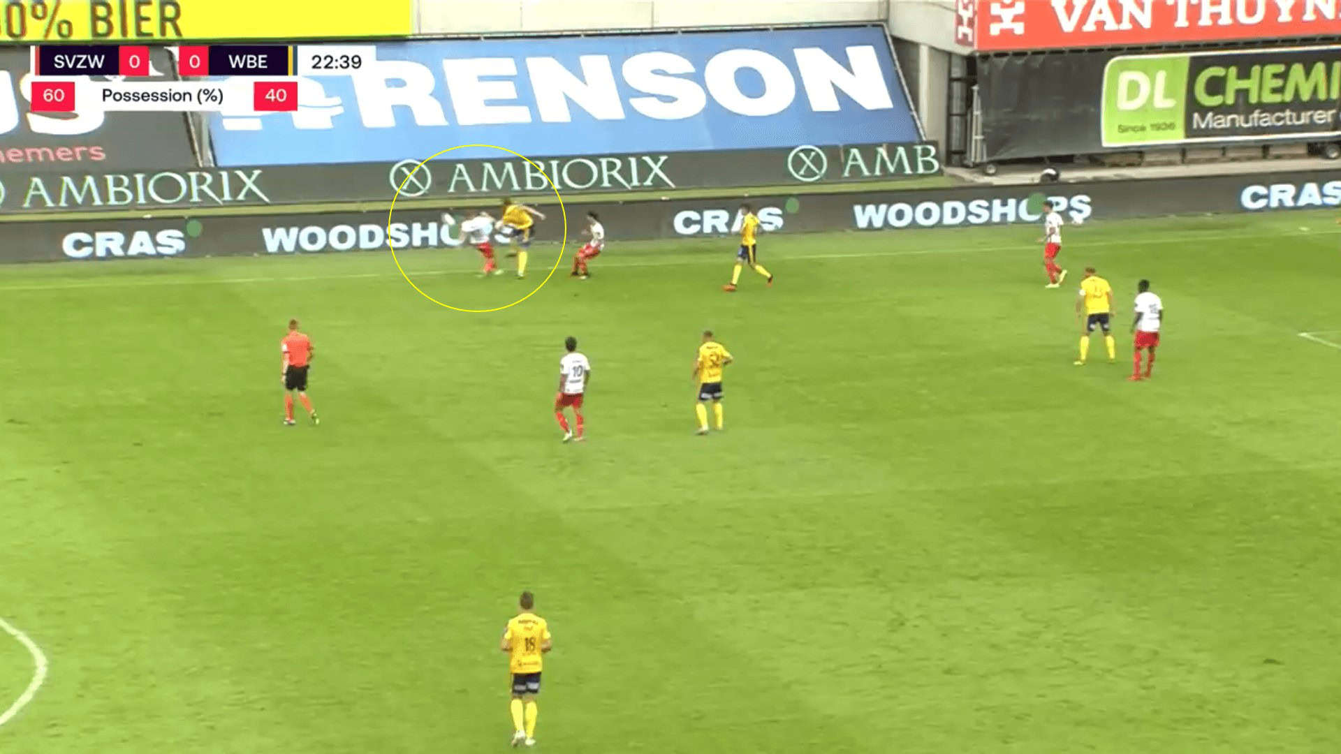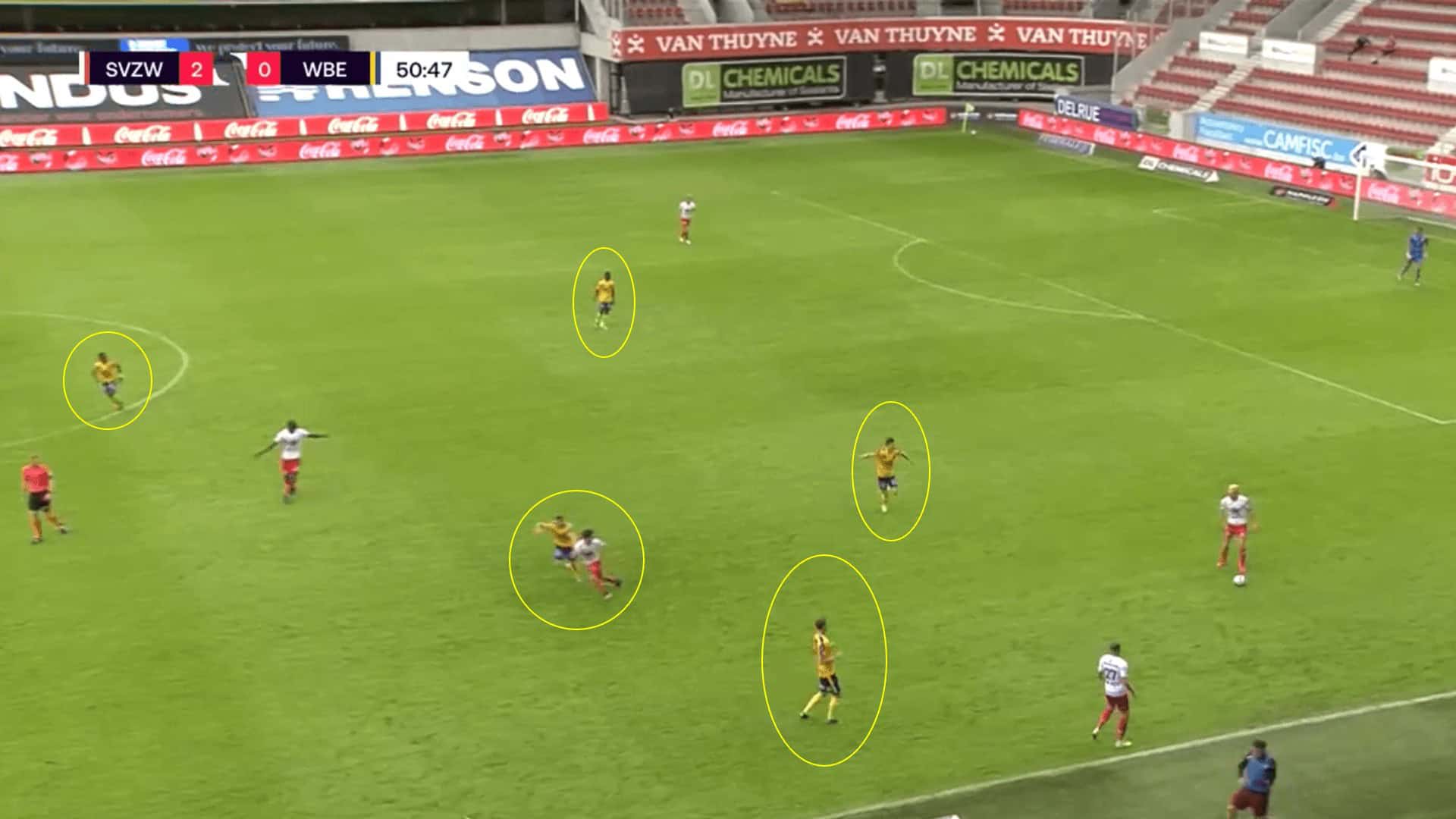 This opportunity happened in the second half because of the press by Beveren being higher, which opened up more space in behind their defenders, meaning Zulte were able to exploit this. Beveren had to change something after going 2-0 down; unfortunately for them, it played right into the hands of Zulte, who were able to exploit it in order to put the game beyond the away side.