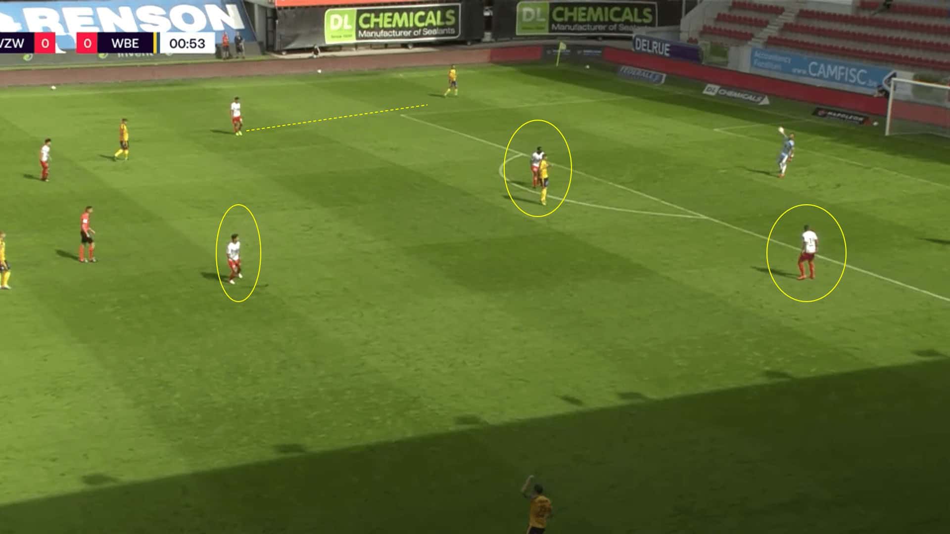 Tactically, Bruno began to operate as an inside forward or second striker, alongside Berahino, putting more pressure on the defence, and opening up even more space on the right-hand side for Opare and the central players. However, he would also appear further wide, making it harder for Beveren to mark him. This was similar for all the front three, as we see from the still below.