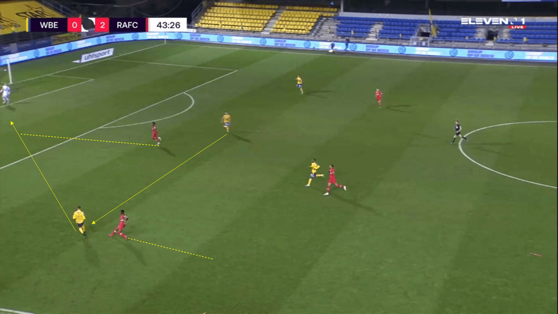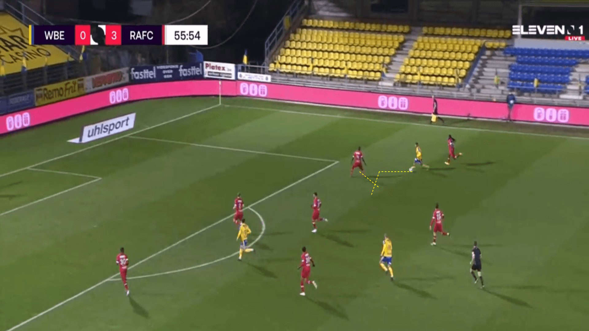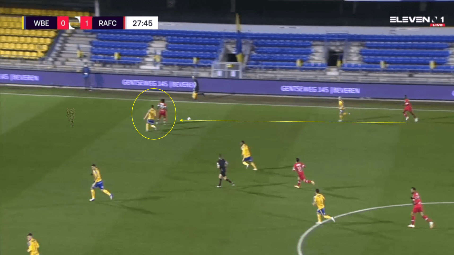 The previously mentioned Seck was arguably their best player, winning 11 duels in the match, according to Fotmob. This included 50% of his attempted tackles, which is impressive when we consider he was up against one of the stronger dribblers in the league in Koita. Below, we see him in a one-on-one situation with an attacker, with plenty of space either side of him for the Beveren player to run into. Seck’s body position is showing the player down the line; however, when the player instead decides to come inside, he is able to quickly change position and win the ball. This was a constant feature of the defenders’ play.