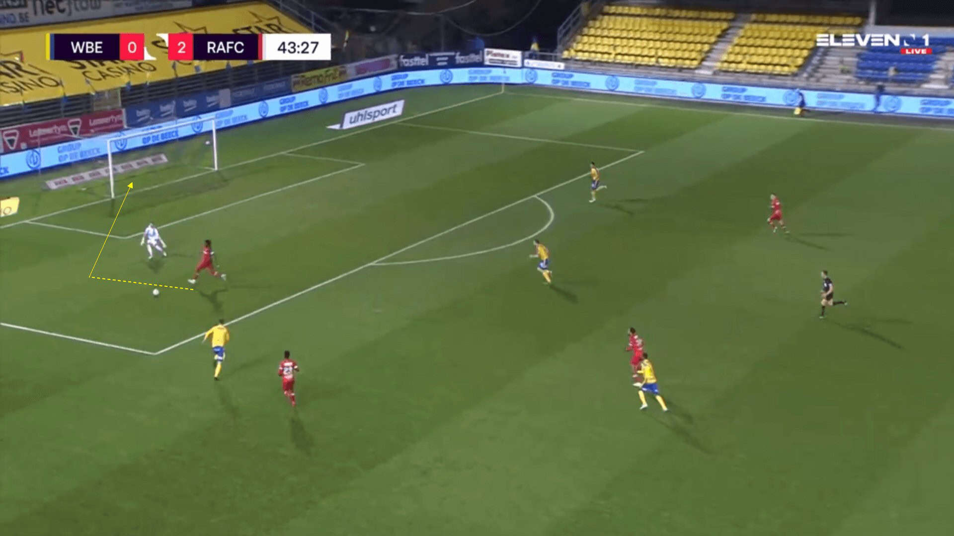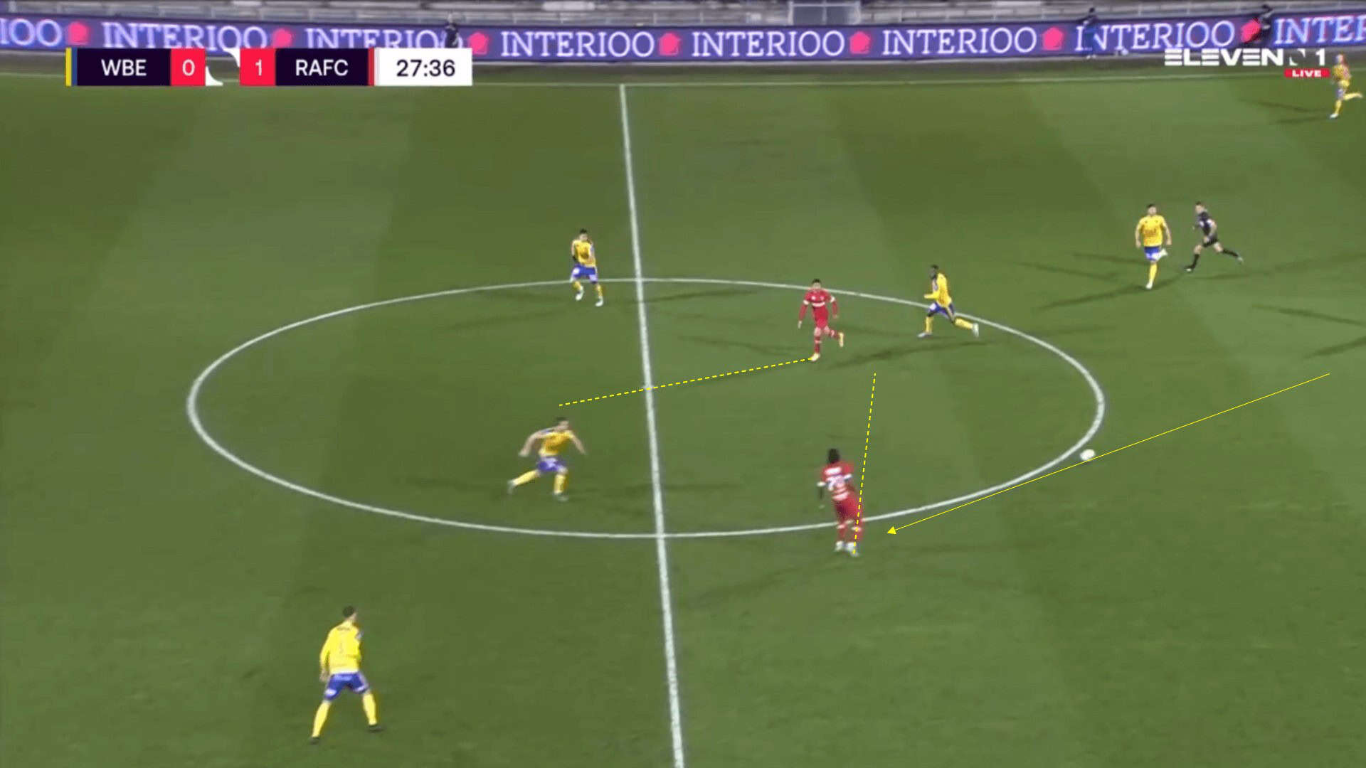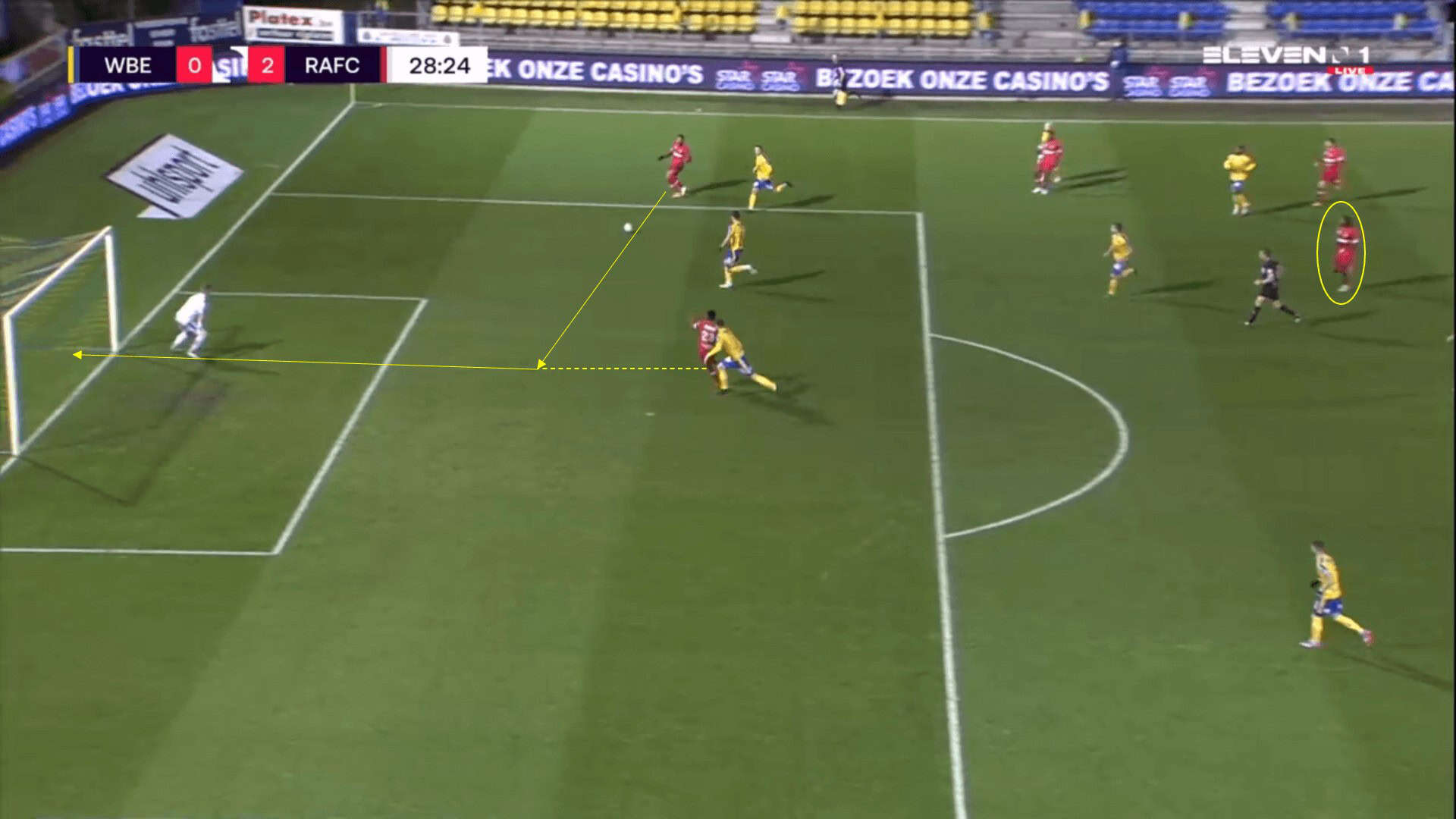 Mbokani is able to drag two defenders to him before he shifts the ball, creating space for the rest of the team. Eventually, it is Haroun who pushes forward on the right-hand side and is able to cross to Ampomah to finish off the move. We see Mbokani deeper at the end of the play, which has allowed for space further forward because of his role as the main striker. With runners off of him, Antwerp are able to create chances like the one analysed.