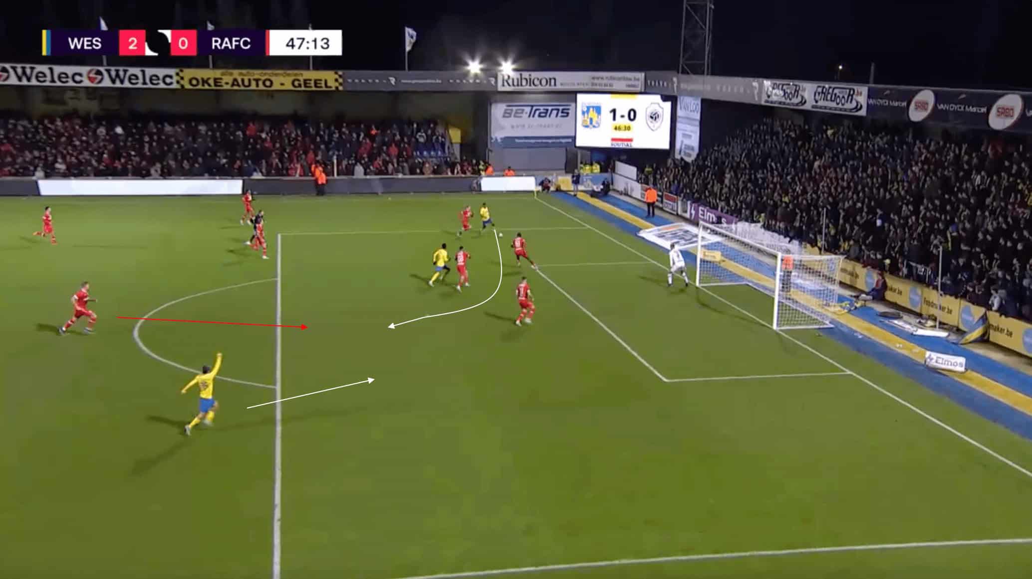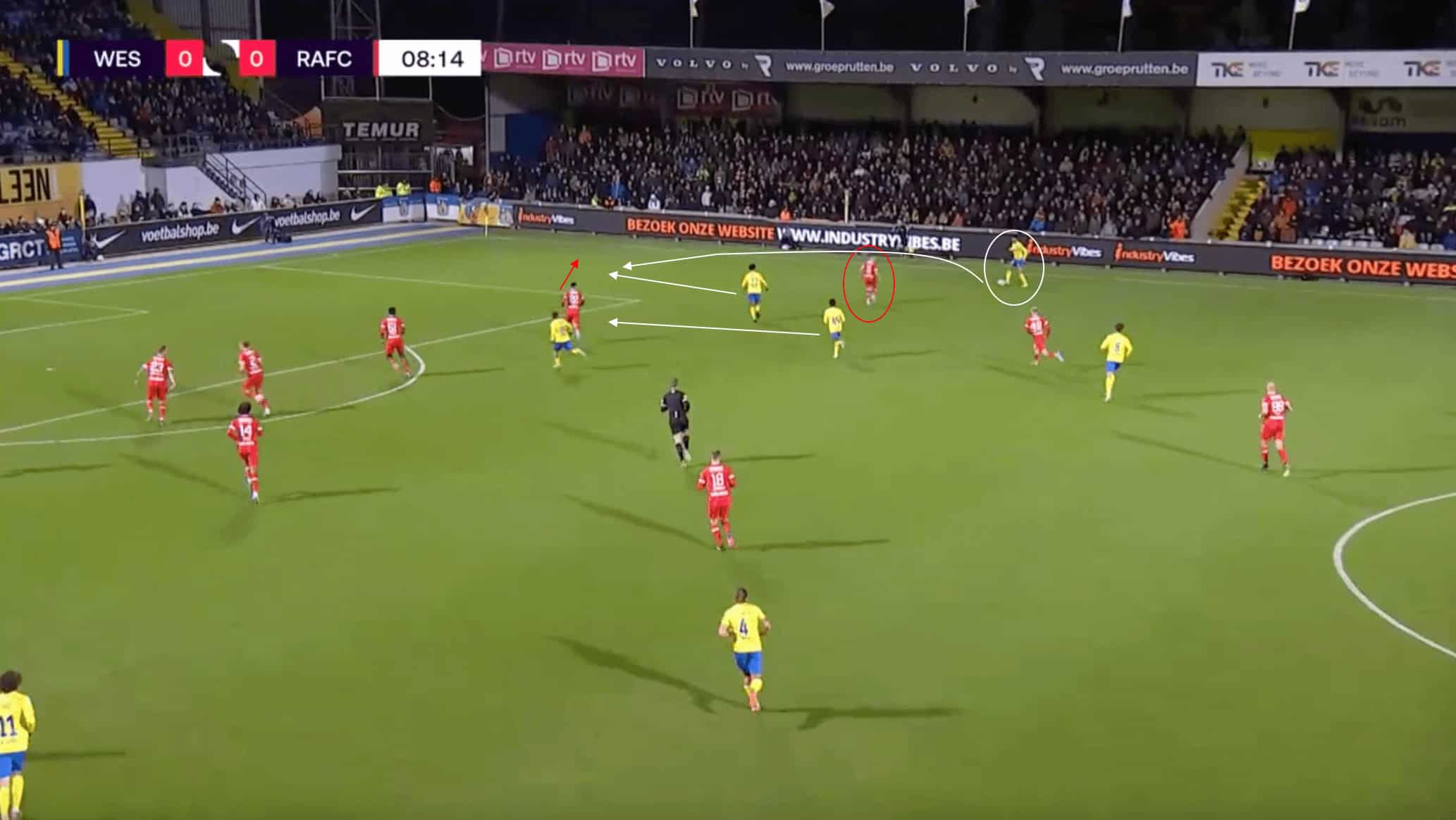 The image above shows an example of Westerlo using the wide spaces to create an overload against the Antwerp fullback, which allowed them to progress the ball into the penalty box and create a decent goal-scoring chance.